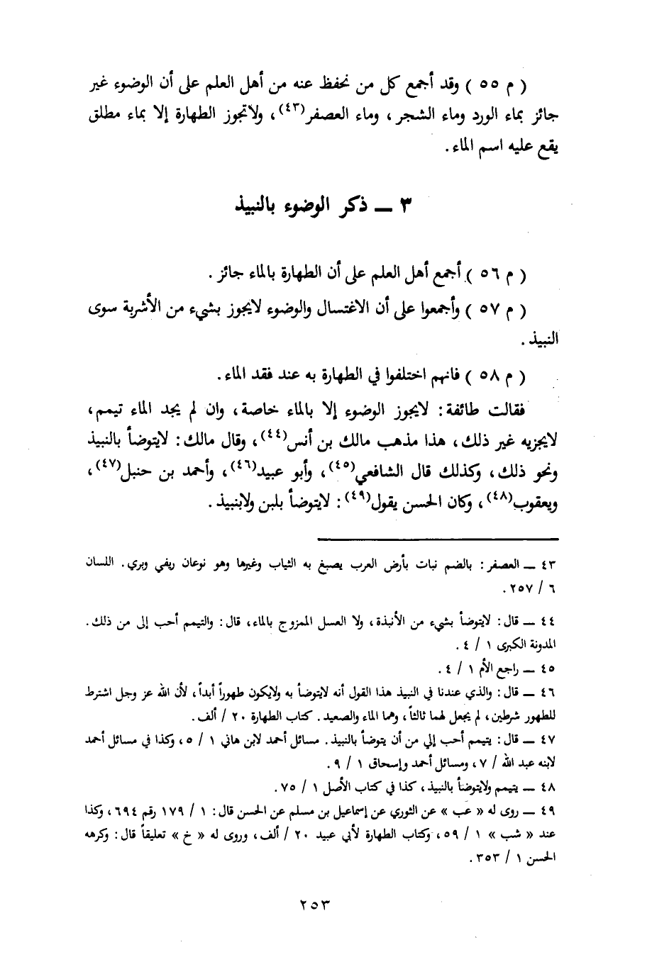 ذِكْرُ الْوُضُوءِ بِالنَّبِيذِ أَجْمَعَ أَهْلُ الْعِلْمِ عَلَى أَنَّ الطَّهَارَةَ بِالْمَاءِ جَائِزٌ، وَأَجْمَعُوا عَلَى أَنَّ الِاغْتِسَالَ وَالْوُضُوءَ لَا يَجُوزُ بِشَيْءٍ مِنَ الْأَشْرِبَةِ سِوَى النَّبِيذِ. فَإِنَّهُمُ اخْتَلَفُوا فِي الطَّهَارَةِ بِهِ عِنْدَ فَقْدِ الْمَاءِ، فَقَالَتْ طَائِفَةٌ: لَا يَجُوزُ الْوُضُوءُ إِلَّا بِالْمَاءِ خَاصَّةً، وَإِنْ لَمْ يَجِدِ الْمَاءَ تَيَمَّمَ لَا يَجْزِيهِ غَيْرَ ذَلِكَ. هَذَا مَذْهَبُ مَالِكِ بْنِ أَنَسٍ. وَقَالَ مَالِكٌ: لَا يَتَوَضَّأُ بِالنَّبِيذِ وَنَحْوِ ذَلِكَ. وَكَذَلِكَ قَالَ: الشَّافِعِيُّ، وَأَبُو عُبَيْدٍ، وَأَحْمَدُ بْنُ حَنْبَلٍ، وَيَعْقُوبُ، وَكَانَ الْحَسَنُ يَقُولُ: لَا يُتَوَضَّأُ بِلَبَنٍ وَلَا بِنَبِيذٍ.