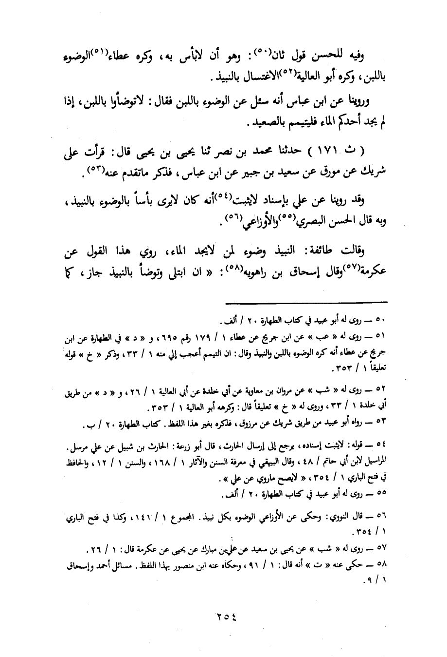 171 - حَدَّثَنَا مُحَمَّدُ بْنُ نَصْرٍ، ثَنَا يَحْيَى بْنُ يَحْيَى، قَالَ: قَرَأْتُ عَلَى شَرِيكٍ عَنْ مُوَرِّقٍ، عَنْ سَعِيدِ بْنِ جُبَيْرٍ، عَنِ ابْنِ عَبَّاسٍ، فَذَكَرَ مَا تَقَدَّمَ عَنْهُ. وَقَدْ رُوِّينَا عَنْ عَلِيٍّ، بِإِسْنَادٍ لَا يَثْبُتُ أَنَّهُ كَانَ لَا يَرَى بَأْسًا بِالْوُضُوءِ بِالنَّبِيذِ. وَبِهِ قَالَ الْحَسَنُ الْبَصْرِيُّ وَالْأَوْزَاعِيُّ. وَقَالَتْ طَائِفَةٌ: النَّبِيذُ وُضُوءٌ لِمَنْ لَا يَجِدُ الْمَاءَ. رُوِيَ هَذَا الْقَوْلُ عَنْ عِكْرِمَةَ. وَقَالَ إِسْحَاقُ بْنُ رَاهَوَيْهِ: إِنِ ابْتُلِيَ وَتَوَضَّأَ بِالنَّبِيذِ جَازَ. كَمَا