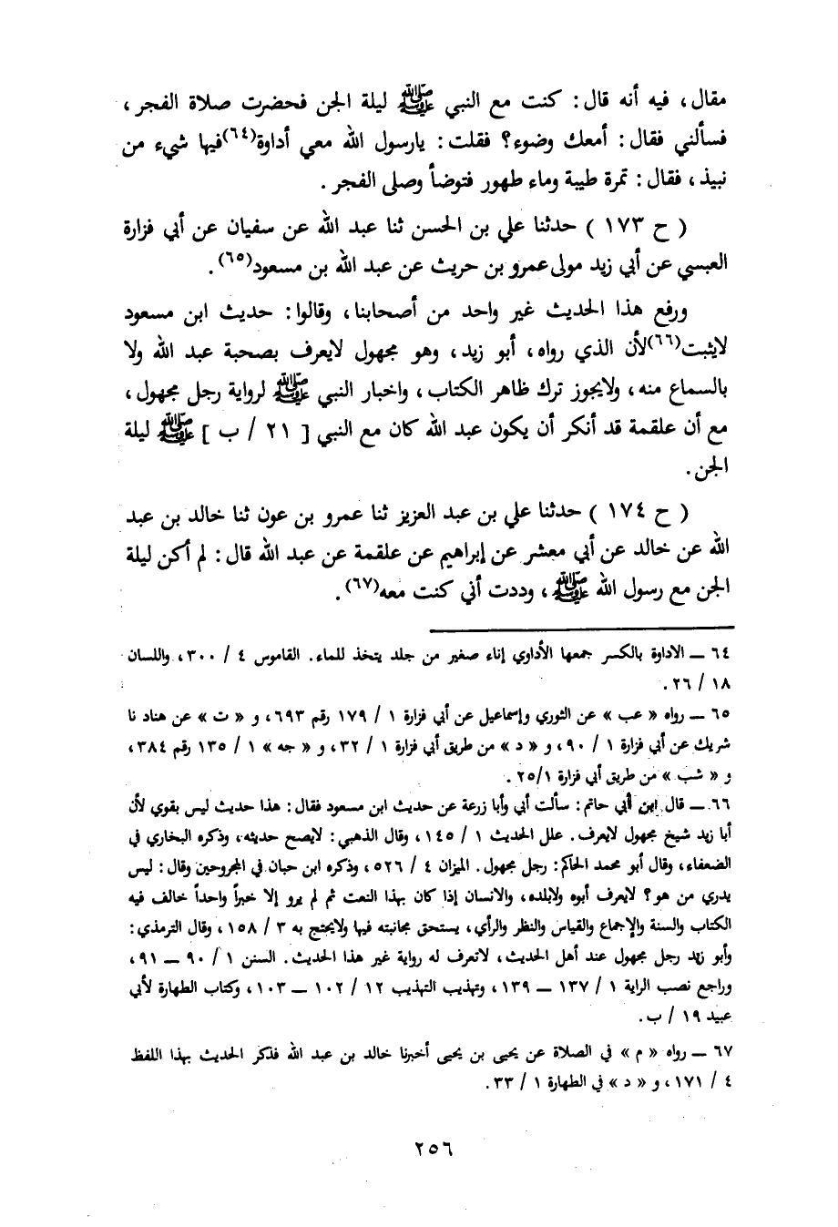 174 - حَدَّثَنَا عَلِيُّ بْنُ عَبْدِ الْعَزِيزِ، ثنا عَمْرُو بْنُ عَوْنٍ، ثنا خَالِدُ بْنُ عَبْدِ اللهِ، عَنْ خَالِدٍ، عَنْ أَبِي مَعْشَرٍ، عَنْ إِبْرَاهِيمَ، عَنْ عَلْقَمَةَ، عَنْ عَبْدِ اللهِ، قَالَ: «لَمْ أَكُنْ لَيْلَةَ الْجِنِّ مَعَ رَسُولِ اللهِ صَلَّى اللَّهُ عَلَيْهِ وَسَلَّمَ، وَدِدْتُ أَنِّي كُنْتُ مَعَهُ» -[257]- وَقَدِ احْتَجَّ مَنْ لَا يُجِيزُ الْوُضُوءَ بِالنَّبِيذِ بِظَاهِرِ قَوْلِهِ {فَلَمْ تَجِدُوا مَاءً فَتَيَمَّمُوا} [النساء: 43] افْتَرَضَ اللهُ الطَّهَارَةَ بِالْمَاءِ، وَفَرَضَ عَلَى مَنْ لَا يَجِدُ الْمَاءَ مِنَ الْمَرْضَى وَالْمُسَافِرِينَ التَّيَمُّمَ بِالصَّعِيدِ فَلَيْسَ يَجُوزُ طَهَارَةٌ إِلَّا بِالْمَاءِ أَوِ الصَّعِيدِ، إِذَا لَمْ يَجِدِ الْمَاءَ وَجَاءَ الْحَدِيثُ عَنِ النَّبِيِّ صَلَّى اللَّهُ عَلَيْهِ وَسَلَّمَ بِالدَّلَالَةِ عَلَى ذَلِكَ