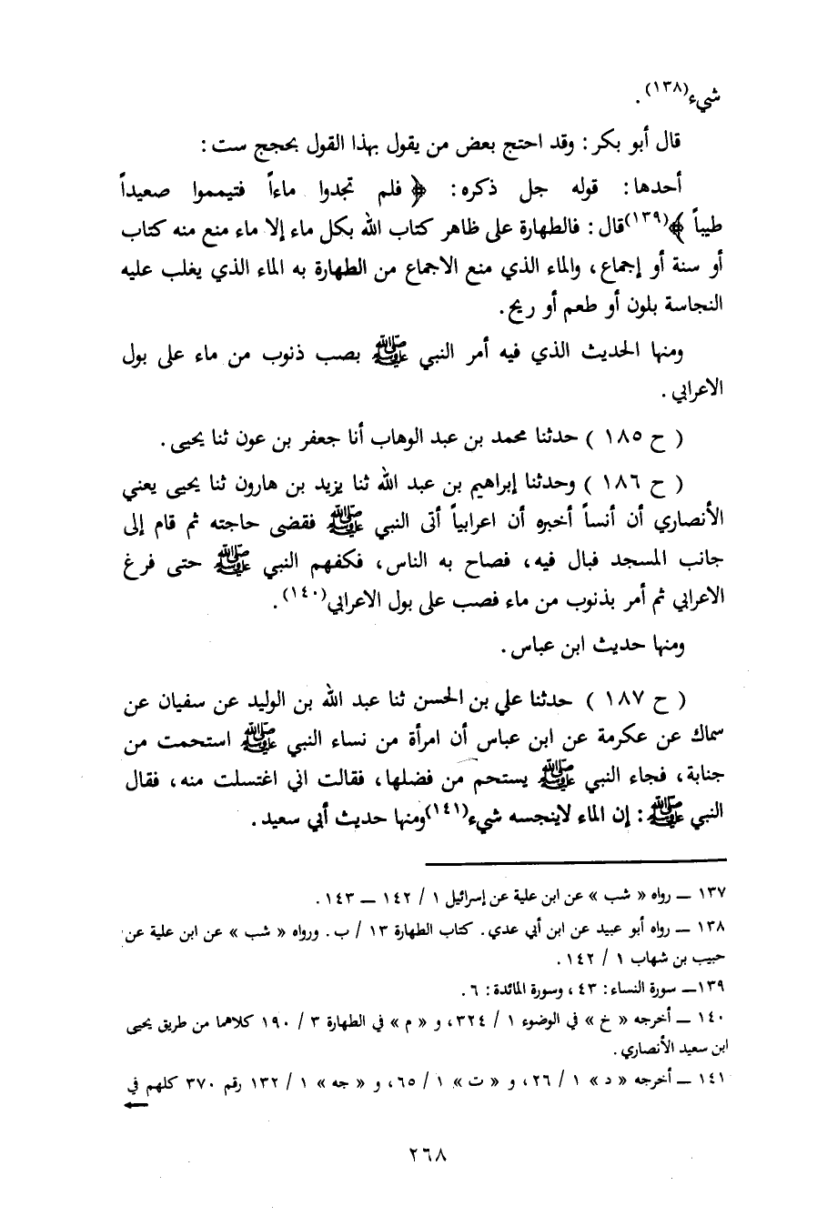 186 - وَحَدَّثَنَا إِبْرَاهِيمُ بْنُ عَبْدِ اللهِ، ثنا يَزِيدُ بْنُ هَارُونَ، ثنا يَحْيَى يَعْنِي الْأَنْصَارِيَّ، أَنَّ أَنَسًا أَخْبَرَهُ أَنَّ أَعْرَابِيًّا أَتَى النَّبِيَّ صَلَّى اللَّهُ عَلَيْهِ وَسَلَّمَ فَقَضَى حَاجَتَهُ، ثُمَّ قَامَ إِلَى جَانِبِ الْمَسْجِدِ فَبَالَ فِيهِ فَصَاحَ بِهِ النَّاسُ، فَكَفَّهُمُ النَّبِيُّ صَلَّى اللَّهُ عَلَيْهِ وَسَلَّمَ حَتَّى فَرَغَ الْأَعْرَابِيُّ، ثُمَّ أَمَرَ بِذَنُوبٍ مِنْ مَاءٍ فَصُبَّ عَلَى بَوْلِ الْأَعْرَابِيِّ وَمِنْهَا حَدِيثُ ابْنِ عَبَّاسٍ