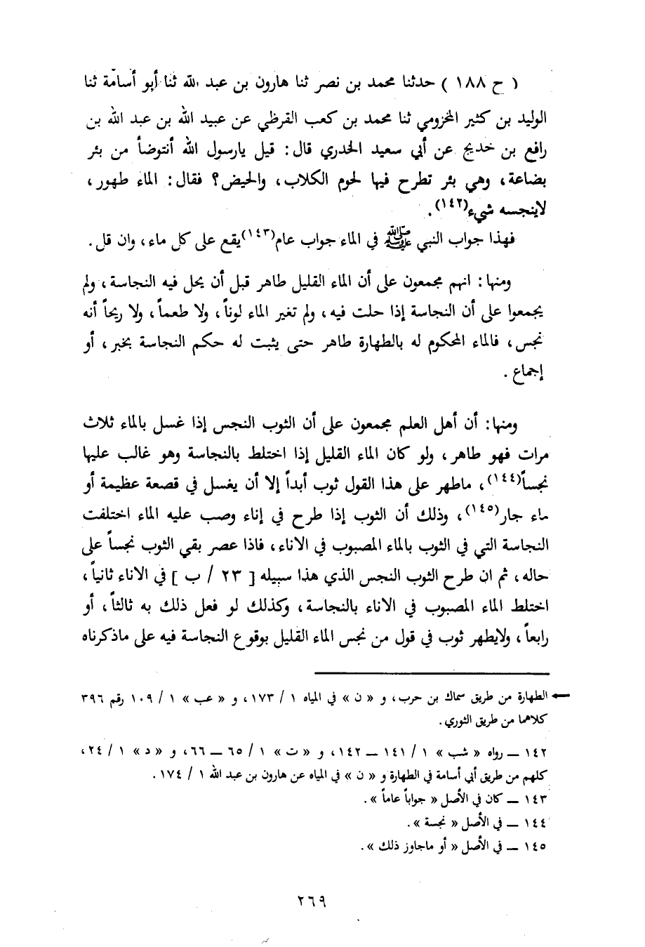 188 - حَدَّثَنَا مُحَمَّدُ بْنُ نَصْرٍ، ثنا هَارُونُ بْنُ عَبْدِ اللهِ، ثنا أَبُو أُسَامَةَ، ثنا الْوَلِيدُ بْنُ كَثِيرٍ الْمَخْزُومِيُّ، ثنا مُحَمَّدُ بْنُ كَعْبٍ الْقُرَظِيُّ، عَنْ عُبَيْدِ اللهِ بْنِ عَبْدِ اللهِ بْنِ رَافِعِ بْنِ خَدِيجٍ، عَنْ أَبِي سَعِيدٍ الْخُدْرِيِّ، قَالَ: قِيلَ يَا رَسُولَ اللهِ أَنَتَوَضَّأُ مِنْ بِئْرِ بُضَاعَةَ وَهِيَ بِئْرٌ تُطْرَحُ فِيهَا لُحُومُ الْكِلَابِ وَالْحُيَّضِ؟ فَقَالَ: «الْمَاءُ طَهُورٌ، لَا يُنَجِّسُهُ شَيْءٌ» فَهَذَا جَوَابُ النَّبِيِّ صَلَّى اللَّهُ عَلَيْهِ وَسَلَّمَ فِي الْمَاءِ جَوَابٌ عَامٌّ يَقَعُ عَلَى كُلِّ مَاءٍ، وَإِنْ قَلَّ. وَمِنْهَا أَنَّهُمْ مَجْمُوعُونَ عَلَى أَنَّ الْمَاءَ الْقَلِيلَ طَاهِرٌ قَبْلَ أَنْ يَحِلَّ فِيهِ النَّجَاسَةُ، وَلَمْ يُجْمِعُوا عَلَى أَنَّ النَّجَاسَةَ إِذَا حَلَّتْ فِيهِ وَلَمْ تُغَيِّرِ الْمَاءَ لَوْنًا، وَلَا طَعْمًا، وَلَا رِيحًا أَنَّهُ نَجَسٌ، فَالْمَاءُ الْمَحْكُومُ لَهُ بِالطَّهَارَةِ طَاهِرٌ حَتَّى يَثْبُتَ لَهُ حُكْمُ النَّجَاسَةِ بِخَبَرٍ أَوْ إِجْمَاعٍ. وَمِنْهَا أَنَّ أَهْلَ الْعِلْمِ مُجْمِعُونَ عَلَى أَنَّ الثَّوْبَ النَّجِسَ إِذَا غُسِلَ بِالْمَاءِ ثَلَاثَ مَرَّاتٍ فَهُوَ طَاهِرٌ، وَلَوْ كَانَ الْمَاءُ الْقَلِيلُ إِذَا اخْتَلَطَ بِالنَّجَاسَةِ وَهُوَ غَالِبٌ عَلَيْهَا نَجَسًا مَا طَهُرَ عَلَى هَذَا الْقَوْلِ ثَوْبٌ أَبَدًا، إِلَّا أَنْ يُغْسَلَ فِي قَصْعَةٍ عَظِيمَةٍ أَوْ مَاءٍ جَارٍ، وَذَلِكَ أَنَّ الثَّوْبَ إِذَا طُرِحَ فِي إِنَاءٍ وَصُبَّ عَلَيْهِ الْمَاءُ اخْتَلَفَتِ النَّجَاسَةُ الَّتِي فِي الثَّوْبِ بِالْمَاءِ الْمَصْبُوبُ فِي الْإِنَاءِ، فَإِذَا عُصِرَ بَقِيَ الثَّوْبُ نَجِسًا عَلَى حَالِهِ، ثُمَّ إِنْ طُرِحَ الثَّوْبُ النَّجَسُ الَّذِي هَذَا سَبِيلُهُ فِي الْإِنَاءِ ثَانِيًا اخْتَلَطَ الْمَاءُ الْمَصْبُوبُ فِي الْإِنَاءِ بِالنَّجَاسَةِ، وَكَذَلِكَ لَوْ فُعِلَ ذَلِكَ بِهِ ثَالِثًا أَوْ رَابِعًا، وَلَا يَطْهُرُ ثَوْبٌ فِي قَوْلِ مَنْ نَجَّسَ الْمَاءَ الْقَلِيلَ بِوُقُوعِ النَّجَاسَةِ فِيهِ عَلَى مَا ذَكَرْنَاهُ -[270]- أَبَدًا، وَلَمَّا أَجْمَعُوا عَلَى أَنَّ الثَّوْبَ يَطْهُرُ بِالْغَسْلَةِ الثَّالِثَةِ، إِذًا لَمْ يَبْقَ فِيهِ أَثَرٌ لَمْ يُذْهِبْهُ الْمَاءُ، دَلَّ ذَلِكَ عَلَى أَنَّ الْمَاءَ إِذَا غَلَبَ عَلَى النَّجَاسَةِ كَانَ طَاهِرًا بِكُلِّ حَالٍ. وَقَدِ احْتَجَّ بَعْضُ أَصْحَابِنَا الْقَائِلِينَ بِالْقُلَّتَيْنِ بِحَدِيثِ ابْنِ عُمَرَ