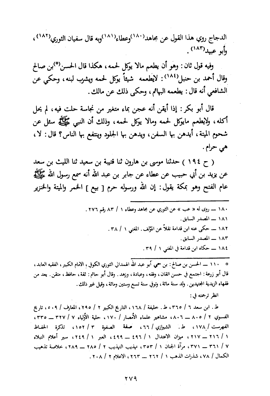 194 - حَدَّثَنَا مُوسَى بْنُ هَارُونَ، ثنا قُتَيْبَةُ بْنُ سَعِيدٍ، ثنا اللَّيْثُ بْنُ سَعْدٍ، عَنْ يَزِيدَ بْنِ أَبِي حَبِيبٍ، عَنْ عَطَاءٍ، عَنْ جَابِرِ بْنِ عَبْدِ اللهِ، أَنَّهُ سَمِعَ رَسُولَ اللهِ صَلَّى اللَّهُ عَلَيْهِ وَسَلَّمَ عَامَ الْفَتْحِ وَهُوَ بِمَكَّةَ يَقُولُ: «إِنَّ اللهَ وَرَسُولَهُ حَرَّمَ بَيْعَ الْخَمْرِ وَالْمَيْتَةِ وَالْخِنْزِيرِ -[280]- وَالْأَصْنَامِ» . فَقِيلَ: يَا رَسُولَ اللهِ، أَرَأَيْتَ شُحُومَ الْمَيْتَةِ يُطْلَى بِهَا السُّفُنُ، وَيُدْهَنُ الْجُلُودُ، وَيَسْتَصْبِحُ بِهَا النَّاسُ قَالَ: «لَا، هُوَ حَرَامٌ» . ثُمَّ قَالَ النَّبِيُّ صَلَّى اللَّهُ عَلَيْهِ وَسَلَّمَ عِنْدَ ذَلِكَ: «قَاتَلَ اللهُ الْيَهُودَ لَمَّا حُرِّمَتْ عَلَيْهِمْ شُحُومُهَا جَمَلُوهُ، ثُمَّ بَاعُوهَ، فَأَكَلُوا ثَمَنَهُ» قَالَ أَبُو بَكْرٍ: فَإِذَا حَرَّمَ رَسُولُ اللهِ صَلَّى اللَّهُ عَلَيْهِ وَسَلَّمَ الِانْتِفَاعَ بِالشَّيْءِ النَّجَسَ حُرِّمَ الِانْتِفَاعُ بِكُلِّ نَجَسٍ، وَذَلِكَ مَعْنَى السُّنَّةِ الثَّابِتَةِ الَّتِي لَا يَجُوزُ تَرْكُهَا، وَلَا الْعُدُولُ عَنْهَا