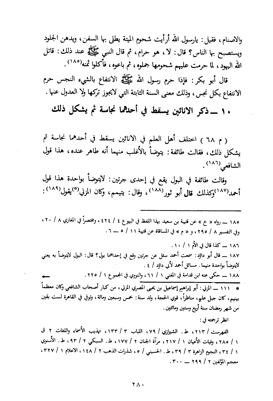 ذِكْرُ الْإِنَاءَيْنِ يَسْقُطُ فِي أَحَدِهِمَا نَجَاسَةٌ ثُمَّ يُشْكِلُ ذَلِكَ اخْتَلَفَ أَهْلُ الْعِلْمِ فِي الْإِنَاءَيْنِ يَسْقُطُ فِي أَحَدِهِمَا نَجَاسَةٌ، ثُمَّ يُشْكِلُ ذَلِكَ، فَقَالَتْ طَائِفَةٌ: يَتَوَضَّأُ بِالْأَغْلَبِ مِنْهُمَا أَنَّهُ طَاهِرٌ عِنْدَهُ، هَذَا قَوْلُ الشَّافِعِيِّ. وَقَالَتْ طَائِفَةٌ فِي الْبَوْلِ يَقَعُ فِي إِحْدَى جَرَّتَيْنِ: لَا يَتَوَضَّأُ بِوَاحِدَةٍ. هَذَا قَوْلُ أَحْمَدَ، وَكَذَلِكَ قَالَ أَبُو ثَوْرٍ، وَقَالَ يَتَيَمَّمُ: وَكَانَ الْمُزَنِيُّ يَقُولُ