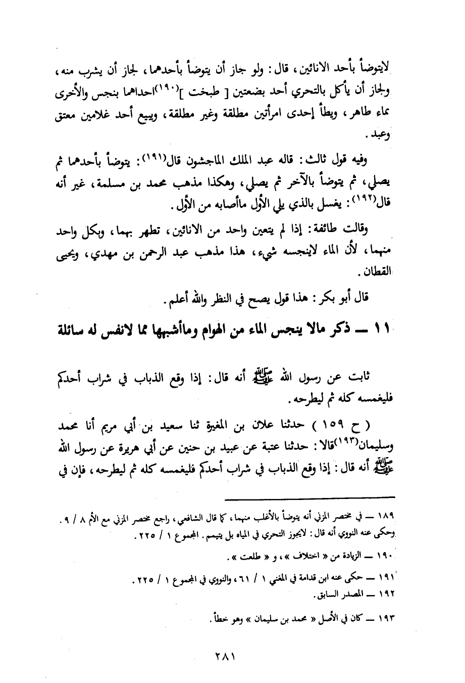 195 - حَدَّثَنَا عَلَّانُ بْنُ الْمُغِيرَةِ، ثنا سَعِيدُ بْنُ أَبِي مَرْيَمَ، أنا مُحَمَّدٌ، وَسُلَيْمَانُ، قَالَا: حَدَّثَنَا عُتْبَةُ، عَنْ عُبَيْدِ بْنِ حُنَيْنٍ، عَنْ أَبِي هُرَيْرَةَ، عَنْ رَسُولِ اللهِ صَلَّى اللَّهُ عَلَيْهِ وَسَلَّمَ أَنَّهُ قَالَ: «إِذَا وَقَعَ الذُّبَابُ فِي شَرَابِ أَحَدِكُمْ فَلْيَغْمِسْهُ كُلَّهُ ثُمَّ لِيَطْرَحْهُ، فَإِنَّ فِي -[282]- إِحْدَى جَنَاحَيْهِ سُمًّا وَبِالْآخَرِ شِفَاءٌ» قَالَ أَبُو بَكْرٍ: وَجَاءَتْ أَخْبَارٌ عَنِ الْأَوَائِلِ مُوَافِقَةٌ لِهَذِهِ السُّنَّةِ. وَقَالَ عَوَامُّ أَهْلِ الْعِلْمِ: إِنَّ الْمَاءَ لَا يَفْسُدُ بِمَوْتِ الذُّبَابِ وَالْخُنْفِسَاءِ وَمَا أَشْبَهَ ذَلِكَ فِيهِ، هَذَا قَوْلُ مَالِكِ بْنِ أَنَسٍ وَأَحْمَدَ وَإِسْحَاقَ وَأَبِي عُبَيْدٍ وَأَبِي ثَوْرٍ، وَرُوِي مَعْنَى هَذَا الْقَوْلِ عَنِ النَّخَعِيِّ وَالْحَسَنِ وَعِكْرِمَةَ وَعَطَاءٍ، قَالَ أَبُو عُبَيْدٍ: وَلَا أَعْلَمُ الْعُلَمَاءَ تَوَسَّعَتْ فِي هَذِهِ دُونَ غَيْرِهَا مِنْ ذَوَاتِ الْأَرْوَاحِ إِلَّا وَأَنَّ هَذِهِ لَا تَرَوَّحُ فِي مَوْتِهَا وَلَا تُنْتِنَ كَغَيْرِهَا لِأَنَّهُ لَا دَمَ لَهَا فَاسْتَوَتْ حَيَاتُهَا وَمَوْتُهَا وَكَذَلِكَ مَا كَانَ مِنْ نَحْوِهَا كَالْجَنَادِبِ وَالصَّرَاصِرِ وَالْعَنَاكِبِ -[283]- وَالْعَقَارِبِ وَجَمِيعِ هَوَامِّ الْأَرْضِ عِنْدِي مِثْلُ ذَلِكَ. قَالَ أَبُو بَكْرٍ: وَلَا أَعْلَمُ أَحَدًا قَالَ غَيْرَ مَا ذَكَرْتُ إِلَّا الشَّافِعِيَّ فَإِنَّ الرَّبِيعَ أَخْبَرَنِي أَنَّهُ قَالَ فِيهَا قَوْلَانِ، هَذَا الَّذِي حَكَيْتُهُ عَنْ جُمَلِ النَّاسِ أَحَدُهُمَا، وَالثَّانِي أَنَّهُ يَنْجُسُ الْمَاءُ بِمَوْتِهِ فِيهِ. قَالَ أَبُو بَكْرٍ: وَالْقَوْلُ الَّذِي يُوَافِقُ السُّنَّةَ وَقَوْلُ سَائِرِ أَهْلِ الْعِلْمِ أَوْلَى بِهِ