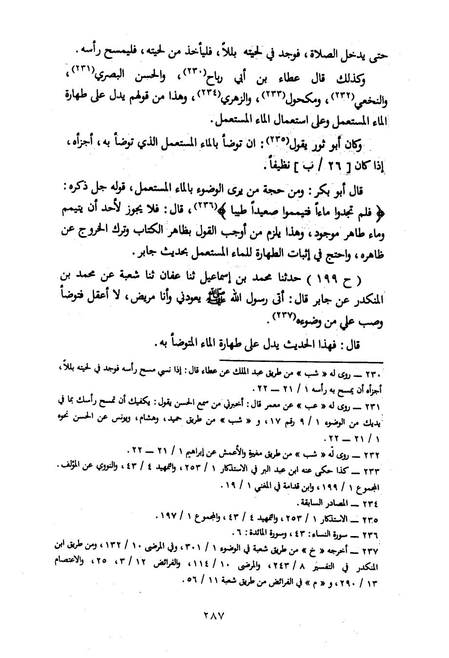 199 - حَدَّثَنَا مُحَمَّدُ بْنُ إِسْمَاعِيلَ، ثنا عَفَّانُ، ثنا شُعْبَةُ، عَنْ مُحَمَّدِ بْنِ الْمُنْكَدِرِ، عَنْ جَابِرٍ، قَالَ: أَتَى رَسُولُ اللهِ صَلَّى اللَّهُ عَلَيْهِ وَسَلَّمَ يَعُودُنِي وَأَنَا مَرِيضٌ لَا أَعْقِلُ، فَتَوَضَّأَ وَصَبَّ عَلَيَّ مِنْ وَضُوئِهِ قَالَ: فَهَذَا الْحَدِيثُ يَدُلُّ عَلَى طَهَارَةِ الْمَاءِ الْمُتَوَضَّأِ بِهِ