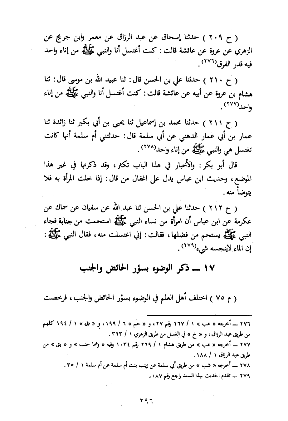 210 - حَدَّثَنَا عَلِيُّ بْنُ الْحَسَنِ، قَالَ: ثنا عُبَيْدُ اللهِ بْنُ مُوسَى، قَالَ: ثنا هِشَامُ بْنُ عُرْوَةَ، عَنْ أَبِيهِ، عَنْ عَائِشَةَ، قَالَتْ: كُنْتُ أَغْتَسِلُ أَنَا وَالنَّبِيُّ صَلَّى اللَّهُ عَلَيْهِ وَسَلَّمَ مِنْ إِنَاءٍ وَاحِدٍ