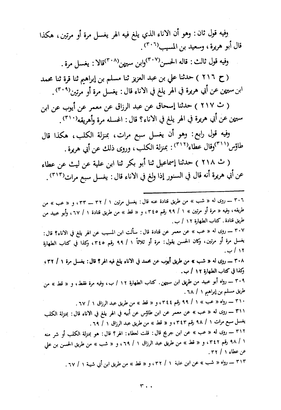 217 - حَدَّثَنَا إِسْحَاقُ، عَنْ عَبْدِ الرَّزَّاقِ، عَنْ مَعْمَرٍ، عَنْ أَيُّوبَ، عَنِ ابْنِ سِيرِينَ، عَنْ أَبِي هُرَيْرَةَ، فِي الْهِرِّ يَلَغُ فِي الْإِنَاءِ قَالَ: «اغْسِلْهُ مَرَّةً وَأَهْرِيقَهُ» وَفِيهِ قَوْلٌ رَابِعٌ وَهُوَ أَنْ يُغْسَلَ سَبْعَ مَرَّاتٍ بِمَنْزِلَةِ الْكَلْبِ هَكَذَا. قَالَ طَاوُسٌ، وَقَالَ عَطَاءٌ: بِمَنْزِلَةِ الْكَلْبِ وَرُوِيَ ذَلِكَ عَنْ أَبِي هُرَيْرَةَ