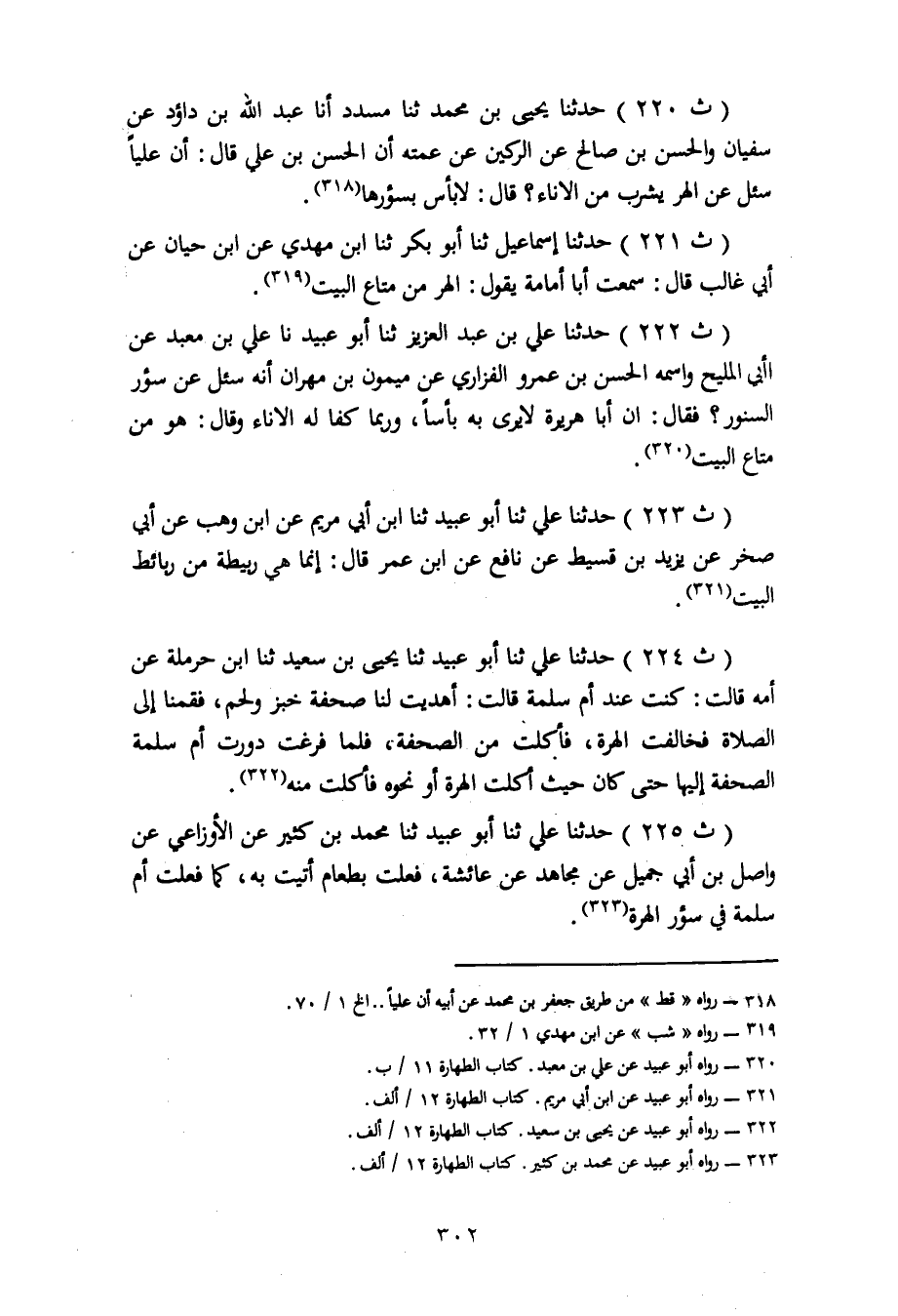 224 - حَدَّثَنَا عَلِيٌّ، ثنا أَبُو عُبَيْدٍ، ثنا يَحْيَى بْنُ سَعِيدٍ، ثنا ابْنُ حَرْمَلَةَ، عَنْ أُمِّهِ، قَالَتْ: كُنْتُ عِنْدَ أُمِّ سَلَمَةَ قَالَتْ: أُهْدِيَتْ لَنَا صَفْحَةُ خُبْزٍ وَلَحْمٍ فَقُمْنَا إِلَى الصَّلَاةِ فَخَالَفَتِ الْهِرَّةُ فَأَكَلَتْ مِنَ الصَّحْفَةِ فَلَمَّا فَرَغَتْ دَوَّرَتْ أُمُّ سَلَمَةَ الصَّحْفَةَ إِلَيْهَا حَتَّى كَانَ حَيْثُ أَكَلَتِ الْهِرَّةُ أَوْ نَحْوَهُ فَأَكَلَتْ مِنْهُ