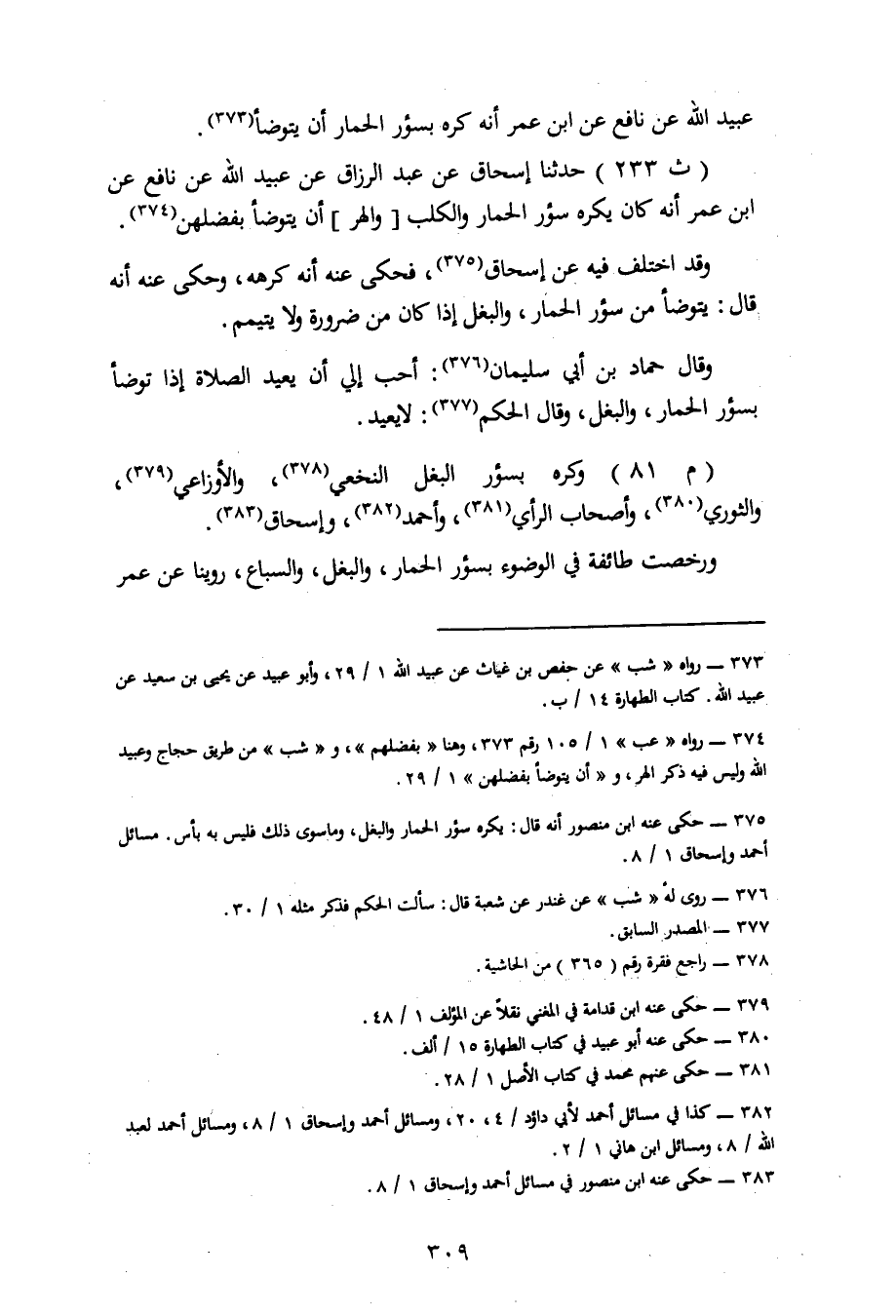 233 - حَدَّثَنَا إِسْحَاقُ، عَنْ عَبْدِ الرَّزَّاقِ، عَنْ عُبَيْدِ اللهِ، عَنْ نَافِعٍ، عَنِ ابْنِ عُمَرَ، أَنَّهُ كَانَ يَكْرَهُ سُؤْرَ الْحِمَارِ وَالْكَلْبِ وَالْهِرِّ أَنْ يُتَوَضَّأَ بِفَضْلِهِنَّ وَقَدِ اخْتُلِفَ فِيهِ عَنْ إِسْحَاقَ فَحُكِيَ عَنْهُ أَنَّهُ كَرِهَهُ وَحُكِيَ عَنْهُ أَنَّهُ قَالَ: يَتَوَضَّأُ مِنْ سُؤْرِ الْحِمَارِ وَالْبَغْلِ إِذَا كَانَ مِنْ ضَرُورَةٍ وَلَا يَتَيَمَّمُ. وَقَالَ حَمَّادُ بْنُ أَبِي سُلَيْمَانَ: أَحَبُّ إِلَيَّ أَنْ يُعِيدَ الصَّلَاةَ إِذَا تَوَضَّأَ بِسُؤْرِ الْحِمَارِ وَالْبَغْلِ، وَقَالَ الْحَكَمُ: لَا يُعِيدُ. وَكَرِهَ بِسُؤْرِ الْبَغْلِ النَّخَعِيُّ وَالْأَوْزَاعِيُّ وَالثَّوْرِيُّ وَأَصْحَابُ الرَّأْيِ وَأَحْمَدُ وَإِسْحَاقُ وَرَخَّصَتْ طَائِفَةٌ فِي الْوُضُوءِ بِسُؤْرِ الْحِمَارِ وَالْبَغْلِ وَالسِّبَاعِ