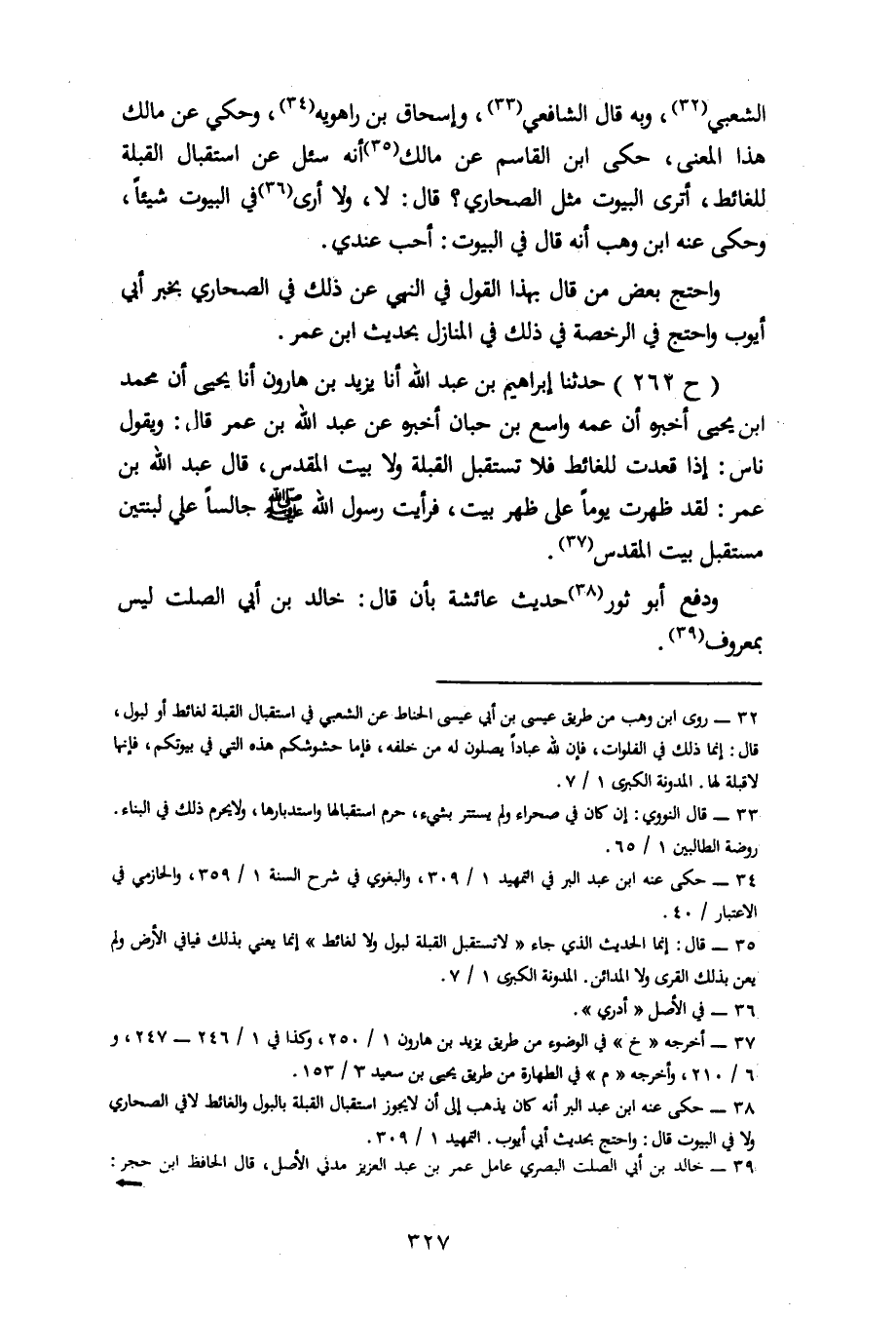 262 - حَدَّثَنَا إِبْرَاهِيمُ بْنُ عَبْدِ اللهِ، أنا يَزِيدُ بْنُ هَارُونَ، أنا يَحْيَى، أَنَّ مُحَمَّدَ بْنَ يَحْيَى، أَخْبَرَهُ أَنَّ عَمَّهُ وَاسِعَ بْنَ حَبَّانَ أَخْبَرَهُ، عَنْ عَبْدِ اللهِ بْنِ عُمَرَ، قَالَ: وَيَقُولُ نَاسٌ: إِذَا قَعَدْتَ لِلْغَائِطِ فَلَا تَسْتَقْبِلِ الْقِبْلَةَ، وَلَا بَيْتَ الْمَقْدِسِ. قَالَ عَبْدُ اللهِ بْنُ عُمَرَ: لَقَدْ ظَهَرْتُ يَوْمًا عَلَى ظَهْرِ بَيْتٍ فَرَأَيْتُ رَسُولَ اللهِ صَلَّى اللَّهُ عَلَيْهِ وَسَلَّمَ جَالِسًا عَلَى لَبِنَتَيْنِ مُسْتَقْبِلَ بَيْتِ الْمَقْدِسِ. وَدَفَعَ أَبُو ثَوْرٍ حَدِيثَ عَائِشَةَ بِأَنْ قَالَ: خَالِدُ بْنُ أَبِي الصَّلْتِ لَيْسَ بِمَعْرُوفٍ. -[328]- وَقَالَ أَحْمَدُ بْنُ حَنْبَلٍ: أَمَّا مَنْ ذَهَبَ إِلَى حَدِيثِ عَائِشَةَ، فَإِنَّ مَخْرَجَهُ حَسَنٌ وَقَالَ غَيْرُ أَحْمَدَ: خَالِدٌ مَعْرُوفٌ، قَدْ رَوَى عَنْهُ خَالِدٌ الْحَذَّاءُ، وَالْمُبَارَكُ بْنُ فَضَالَةَ، وَوَاصِلٌ مَوْلَى أَبِي عُيَيْنَةَ. قَالَ أَبُو بَكْرٍ: وَأَصَحُّ هَذِهِ الْمَذَاهِبِ مَذْهَبُ مَنْ فَرَّقَ بَيْنَ الصَّحَارِي وَالْمَنَازِلِ فِي هَذَا الْبَابِ، وَذَلِكَ أَنْ يَكُونَ ظَاهِرُ نَهْيِ النَّبِيِّ صَلَّى اللَّهُ عَلَيْهِ وَسَلَّمَ عَلَى الْعُمُومِ إِلَّا مَا خَصَّتْهُ السُّنَّةُ، فَيَكُونُ مَا خَصَّتْهُ السُّنَّةُ مُسْتَثْنًى مِنْ جُمْلَةِ النَّهْيِ. وَإِنَّمَا تَكُونُ الْأَخْبَارُ مُتَضَادَّةً إِذَا جَاءَتْ جُمْلَةً فِيهَا ذِكْرُ النَّهْيِ، يُقَابِلُ جُمْلَةَ مَا فِيهَا ذِكْرُ الْإِبَاحَةِ، فَلَا يُمْكِنُ اسْتِعْمَالُ شَيْءٍ مِنْهَا إِلَّا بِطَرْحِ مَا ضَادَّهَا، وَسَبِيلُ هَذَا كَسَبِيلِ نَهْيِ النَّبِيِّ صَلَّى اللَّهُ عَلَيْهِ وَسَلَّمَ عَنْ بَيْعِ الثَّمَرِ بِالثَّمَرِ جُمْلَةً، ثُمَّ رَخَّصَ فِي بَيْعِ الْعَرَايَا بِخَرْصِهَا، فَبَيْعُ الْعَرِيَّةِ مُسْتَثْنًى مِنْ جُمْلَةِ نَهْيِ النَّبِيِّ صَلَّى اللَّهُ عَلَيْهِ وَسَلَّمَ عَنْ بَيْعِ الثَّمَرِ بِالثَّمَرِ، وَكَذَلِكَ نَهْيُهُ عَنْ بَيْعِ مَا لَيْسَ عِنْدَ الْمَرْءِ وَإِذْنُهُ فِي السَّلَمِ، وَهَذَا الْوَجْهُ مَوْجُودٌ فِي كَثِيرٍ مِنَ السُّنَنِ، وَاللهُ أَعْلَمُ. فَلَمَّا نَهَى رَسُولُ اللهِ صَلَّى اللَّهُ عَلَيْهِ وَسَلَّمَ عَنِ اسْتِقْبَالِ الْقِبْلَةِ بِالْغَائِطِ وَالْبَوْلِ نَهْيًا عَامًّا وَاسْتَقْبَلَ بَيْتَ الْمَقْدِسِ مُسْتَدْبِرًا الْكَعْبَةَ، كَانَ إِبَاحَةُ ذَلِكَ فِي الْمَنَازِلِ مَخْصُوصٌ مِنْ جُمْلَةِ النَّهْيِ