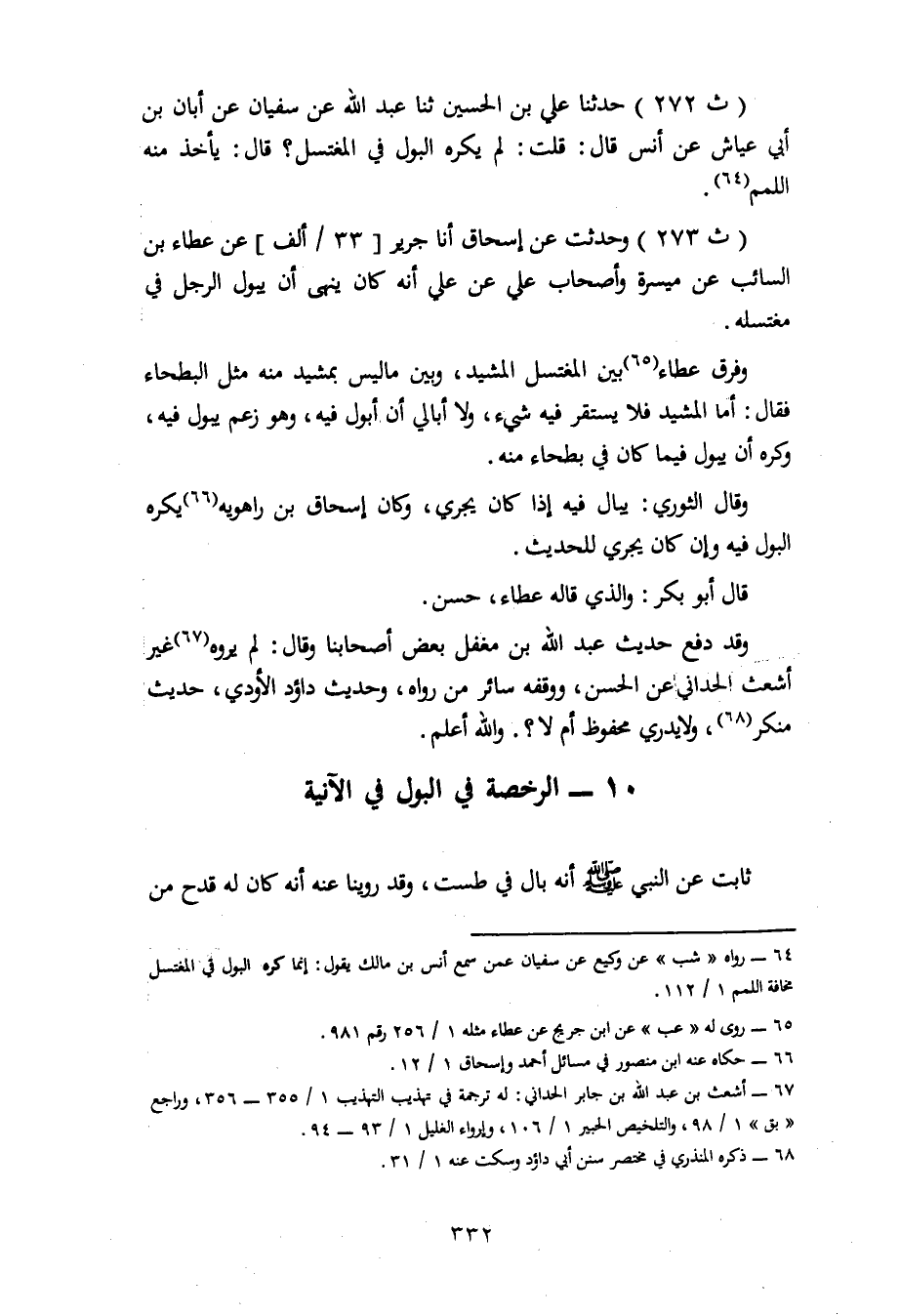 273 - وَحُدِّثْتُ عَنْ إِسْحَاقَ، أنا جَرِيرٌ، عَنْ عَطَاءِ بْنِ السَّائِبِ، عَنْ مَيْسَرَةَ، وَأَصْحَابِ عَلِيٍّ، عَنْ عَلِيٍّ، أَنَّهُ كَانَ يَنْهَى أَنْ يَبُولَ الرَّجُلُ فِي مُغْتَسَلِهِ وَفَرَّقَ عَطَاءٌ بَيْنَ الْمُغْتَسَلِ الْمُشَيَّدِ، وَبَيْنَ مَا لَيْسَ بِمُشَيَّدٍ مِنْهُ مِثْلَ الْبَطْحَاءِ، فَقَالَ: أَمَّا الْمُشَيَّدُ فَلَا يَسْتَقِرُّ فِيهِ شَيْءٌ، وَلَا أُبَالِي أَنْ أَبُولَ فِيهِ، وَهُوَ زَعَمَ يَبُولُ فِيهِ وَكَرِهَ أَنْ يَبُولَ فِيمَا كَانَ فِي بَطْحَاءَ مِنْهُ، وَقَالَ الثَّوْرِيُّ: يُبَالُ فِيهِ إِذَا كَانَ يَجْرِي. وَكَانَ إِسْحَاقُ بْنُ رَاهَوَيْهِ يَكْرَهُ الْبَوْلَ فِيهِ، وَإِنْ كَانَ يَجْرِي لِلْحَدِيثِ. قَالَ أَبُو بَكْرٍ: وَالَّذِي قَالَهُ عَطَاءٌ حَسَنٌ. وَقَدْ دَفَعَ حَدِيثَ عَبْدِ اللهِ بْنِ مُغَفَّلٍ بَعْضُ أَصْحَابِنَا، وَقَالَ: لَمْ يَرْوِهِ غَيْرُ أَشْعَثُ الْحُدَّانِيُّ عَنِ الْحَسَنِ، وَوَقَفَهُ سَائِرُ مَنْ رَوَاهُ، وَحَدِيثُ دَاوُدَ الْأَوْدِيِّ حَدِيثٌ مُنْكَرٌ، وَلَا يُدْرَى مَحْفُوظٌ أَمْ لَا، وَاللهُ أَعْلَمُ.