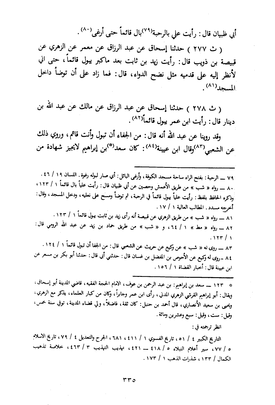 277 - حَدَّثَنَا إِسْحَاقُ، عَنْ عَبْدِ الرَّزَّاقِ، عَنْ مَعْمَرٍ، عَنِ الزُّهْرِيِّ، عَنْ قَبِيصَةَ بْنِ ذُؤَيْبٍ، قَالَ: " رَأَيْتُ زَيْدَ بْنَ ثَابِتٍ بَعْدَ مَا كَبِرَ يَبُولُ قَائِمًا حَتَّى إِنِّي لَأَنْظُرُ إِلَيْهِ عَلَى قَدَمَيْهِ مِثْلَ نَضْحِ الدَّوَاءِ، قَالَ: فَمَا زَادَ عَلَى أَنْ تَوَضَّأَ دَاخِلَ الْمَسْجِدِ "