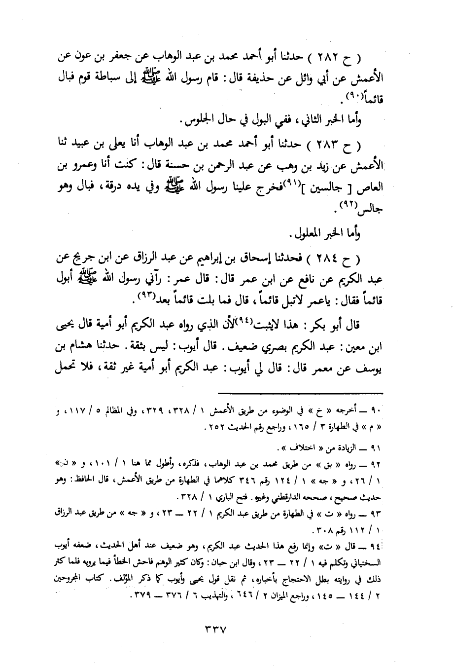 284 - فَحَدَّثَنَا إِسْحَاقُ بْنُ إِبْرَاهِيمَ، عَنْ عَبْدِ الرَّزَّاقِ، عَنْ ابن جُرَيْجٍ، عَنْ عَبْدِ الْكَرِيمِ، عَنْ نَافِعٍ، عَنِ ابْنِ عُمَرَ، قَالَ: قَالَ عُمَرُ: رَآنِي رَسُولُ اللهِ صَلَّى اللَّهُ عَلَيْهِ وَسَلَّمَ أَبُولُ قَائِمًا، فَقَالَ: «يَا عُمَرُ، لَا تَبُلْ قَائِمًا» . قَالَ: فَمَا بُلْتُ قَائِمًا بَعْدُ. قَالَ أَبُو بَكْرٍ: هَذَا لَا يَثْبُتُ؛ لِأَنَّ الَّذِي رَوَاهُ عَبْدُ الْكَرِيمِ أَبُو أُمَيَّةَ. قَالَ يَحْيَى بْنُ مَعِينٍ: عَبْدُ الْكَرِيمِ بَصْرِيٌّ ضَعِيفٌ، قَالَ أَيُّوبُ: لَيْسَ بِثِقَةٍ. حَدَّثَنَا هِشَامُ بْنُ يُوسُفَ عَنْ مَعْمَرٍ قَالَ: قَالَ لِي أَيُّوبُ: عَبْدُ الْكَرِيمِ أَبُو أُمَيَّةَ غَيْرُ ثِقَةٍ، فَلَا تَحْمِلْ -[338]- عَنْهُ. وَحُدِّثْتُ عَنِ الْأَثْرَمِ، قَالَ: قَالَ أَبُو عَبْدِ اللهِ أَحْمَدُ بْنُ حَنْبَلٍ: عَبْدُ الْكَرِيمِ أَبُو أُمَيَّةَ، قَدْ ضَرَبْتُ عَلَيْهِ فَاضْرِبْ عَلَيْهِ. قَالَ أَبُو بَكْرٍ: وَمَعَهُ مِنْ حَدِيثِهِ شَاهِدٌ يَدُلُّ عَلَى مَا قَالُوا. قَالَ أَبُو بَكْرٍ: يَبُولُ جَالِسًا أَحَبُّ إِلَيَّ لِلثَّابِتِ عَنْ نَبِيِّ اللهِ صَلَّى اللَّهُ عَلَيْهِ وَسَلَّمَ أَنَّهُ بَالَ جَالِسًا؛ وَلَأَنَّ أَهْلَ الْعِلْمِ لَا يَخْتَلِفُونَ فِيهِ، وَلَا أَنْهِي عَنِ الْبَوْلِ قَائِمًا لِثُبُوتِ حَدِيثِ حُذَيْفَةَ، وَقَدْ ثَبَتَ عَنْ عُمَرَ أَنَّهُ قَالَ: مَا بُلْتُ قَائِمًا مُنْذُ أَسْلَمْتُ. فَقَدْ يَجُوزُ أَنْ يَكُونَ عُمَرُ إِلَى الْوَقْتِ الَّذِي قَالَ هَذَا الْقَوْلَ لَمْ يَكُنْ بَالَ قَائِمًا، ثُمَّ بَالَ بَعْدَ ذَلِكَ قَائِمًا، فَرَآهُ زَيْدُ بْنُ وَهْبٍ، فَلَا يَكُونُ حَدِيثَاهُ مُتَضَادَّيْنِ