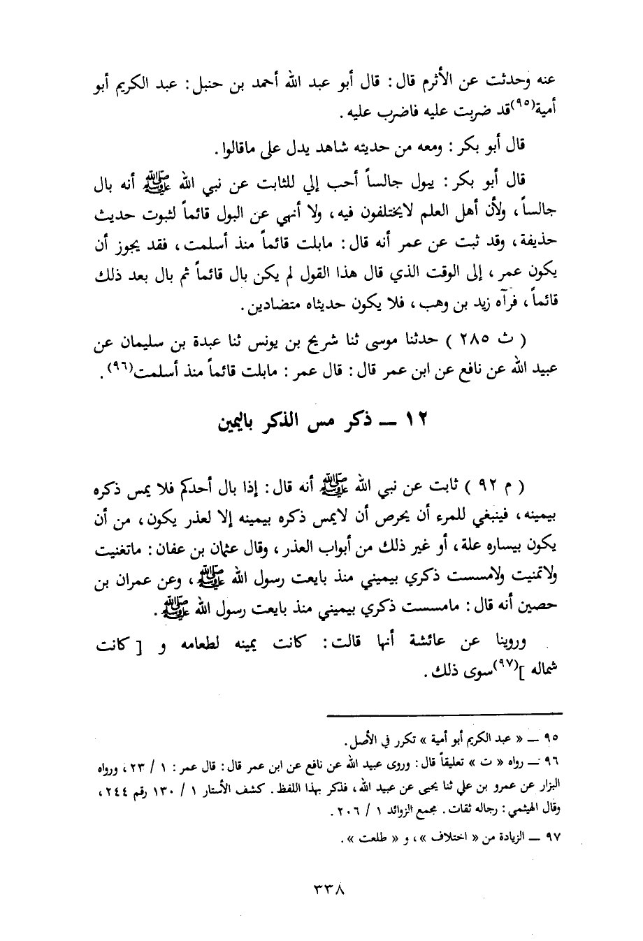 ذِكْرُ مَسِّ الذَّكَرِ بِالْيَمِينِ ثَابِتٌ عَنْ نَبِيِّ اللهِ صَلَّى اللَّهُ عَلَيْهِ وَسَلَّمَ أَنَّهُ قَالَ: «إِذَا بَالَ أَحَدُكُمْ فَلَا يَمَسَّ ذَكَرَهُ بِيَمِينِهِ» . فَيَنْبَغِي لِلْمَرْءِ أَنْ يَحْرِصَ أَنْ لَا يَمَسَّ ذَكَرَهُ بِيَمِينِهِ إِلَّا لِعُذْرٍ يَكُونُ مِنْ أَنْ يَكُونَ بِيَسَارِهِ عِلَّةٌ، ذَلِكَ مِنْ أَبْوَابِ الْعُذْرِ، وَقَالَ عُثْمَانُ بْنُ عَفَّانَ: مَا تَغَنَّيْتُ، وَلَا تَمَنَّيْتُ، وَلَا مَسِسْتُ ذَكَرِي بِيَمِينِي مُنْذُ بَايَعْتُ رَسُولَ اللهِ صَلَّى اللَّهُ عَلَيْهِ وَسَلَّمَ. وَعَنْ عِمْرَانَ بْنِ حُصَيْنٍ أَنَّهُ قَالَ: مَا مَسِسْتُ ذَكَرِي بِيَمِينِي مُنْذُ بَايَعْتُ رَسُولَ اللهِ صَلَّى اللَّهُ عَلَيْهِ وَسَلَّمَ. وَرُوِّينَا عَنْ عَائِشَةَ أَنَّهَا قَالَتْ: كَانَتْ يَمِينُهُ لِطَعَامِهِ، وَكَانَتْ شِمَالُهُ سِوَى ذَلِكَ.