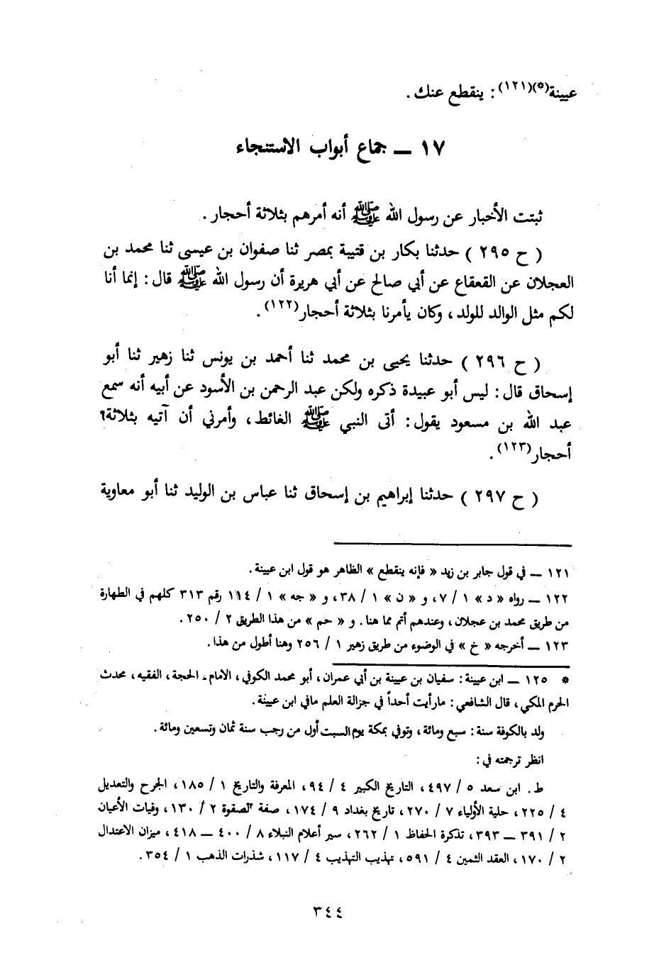 297 - حَدَّثَنَا إِبْرَاهِيمُ بْنُ إِسْحَاقَ، ثنا عَبَّاسُ بْنُ الْوَلِيدِ، ثنا أَبُو مُعَاوِيَةَ، -[345]- عَنِ الْأَعْمَشِ، عَنْ أَبِي سُفْيَانَ، عَنْ جَابِرٍ، قَالَ: قَالَ رَسُولُ اللهِ صَلَّى اللَّهُ عَلَيْهِ وَسَلَّمَ: «إِذَا اسْتَجْمَرَ أَحَدُكُمْ فَلْيَسْتَجْمِرْ ثَلَاثًا» وَحَدَّثَنِي عَلِيٌّ، عَنْ أَبِي عُبَيْدٍ، قَالَ: قَالَ عَبْدُ الرَّحْمَنِ بْنُ مَهْدِيٍّ فَسَّرَ مَالِكُ بْنُ أَنَسٍ قَوْلَهُ: اسْتَجْمِرُوا أَنَّهُ الِاسْتِنْجَاءُ. قَالَ: وَكَذَلِكَ قَالَ: الْكِسَائِيُّ وَأَبُو عَمْرٍو وَأَبُو زَيْدٍ. قَالَ أَبُو بَكْرٍ: وَقَدِ اخْتَلَفَ أَصْحَابُ رَسُولِ اللهِ صَلَّى اللَّهُ عَلَيْهِ وَسَلَّمَ وَمَنْ بَعْدَهُمْ فِي الِاسْتِنْجَاءِ، فَرَأَتْ طَائِفَةٌ مِنْهُمُ الِاسْتِنْجَاءَ بِالْأَحْجَارِ، وَمِمَّنْ كَانَ يَسْتَنْجِي بِثَلَاثَةِ أَحْجَارٍ ابْنُ عُمَرَ، وَرُوِيَ ذَلِكَ عَنْ خُزَيْمَةَ بْنِ ثَابِتٍ، وَهَذَا قَوْلُ الْحَسَنِ، وَسَعِيدِ بْنِ الْمُسَيِّبِ، وَرُوِّينَا عَنْ عُمَرَ بْنِ الْخَطَّابِ أَنَّهُ بَالَ، ثُمَّ أَخَذَ حَجَرًا فَمَسَحَ بِهِ ذَكَرَهُ. -[346]- وَمِمَّنْ رُوِيَ عَنْهُ أَنَّهُ أَنْكَرَ الِاسْتِنْجَاءَ بِالْمَاءِ حُذَيْفَةُ، وَسَعْدُ بْنُ مَالِكٍ، وَابْنُ الزُّبَيْرِ