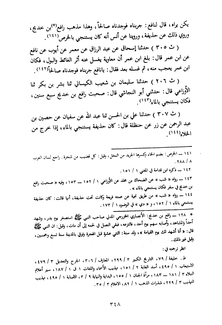 306 - حَدَّثَنَا سُلَيْمَانُ بْنُ شُعَيْبٍ الْكَيْسَانِيُّ، ثنا بِشْرُ بْنُ بَكْرٍ، ثنا الْأَوْزَاعِيُّ، قَالَ: حَدَّثَنِي أَبُو النَّجَاشِيِّ، قَالَ: «صَحِبْتُ رَافِعَ بْنَ خَدِيجٍ سَبْعَ سِنِينَ، فَكَانَ يَسْتَنْجِي بِالْمَاءِ»