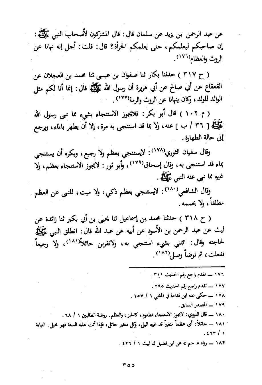 317 - حَدَّثَنَا بَكَّارٌ، ثنا صَفْوَانُ بْنُ عِيسَى، ثنا مُحَمَّدُ بْنُ الْعَجْلَانَ، عَنِ الْقَعْقَاعِ، عَنْ أَبِي صَالِحٍ، عَنْ أَبِي هُرَيْرَةَ، أَنَّ رَسُولَ اللهِ صَلَّى اللَّهُ عَلَيْهِ وَسَلَّمَ قَالَ: «إِنَّمَا أَنَا لَكُمُ مِثْلُ الْوَالِدِ لِلْوَلَدِ» ، وَكَانَ يَنْهَانَا عَنِ الرَّوْثِ وَالرِّمَّةِ " قَالَ أَبُو بَكْرٍ: فَلَا يَجُوزُ الِاسْتِنْجَاءُ بِشَيْءٍ مِمَّا نَهَى رَسُولُ اللهِ صَلَّى اللَّهُ عَلَيْهِ وَسَلَّمَ عَنْهُ، وَلَا بِمَا قَدِ اسْتُنْجِيَ بِهِ مَرَّةً إِلَّا أَنْ يُطَهَّرَ بِالْمَاءِ، وَيَرْجِعُ إِلَى حَالَةِ الطَّهَارَةِ. وَقَالَ سُفْيَانُ الثَّوْرِيُّ: لَا يُسْتَنْجَى، لَا يُسْتَنْجَى بِعَظْمٍ، وَلَا رَجِيعٍ، وَيُكْرَهُ أَنْ يُسْتَنْجَى بِمَاءٍ قَدِ اسْتُنْجِيَ بِهِ، وَقَالَ إِسْحَاقُ وَأَبُو ثَوْرٍ: لَا يَجُوزُ الِاسْتِنْجَاءُ بِعَظْمٍ وَلَا غَيْرِهِ مِمَّا نَهَى عَنْهُ النَّبِيُّ صَلَّى اللَّهُ عَلَيْهِ وَسَلَّمَ، وَقَالَ الشَّافِعِيُّ: لَا يُسْتَنْجَى بِعَظْمِ ذَكِيٍّ، وَلَا مَيِّتٍ؛ لِلنَّهْىِ عَنِ الْعَظْمِ مُطْلَقًا، وَلَا بِحِمَمِهِ