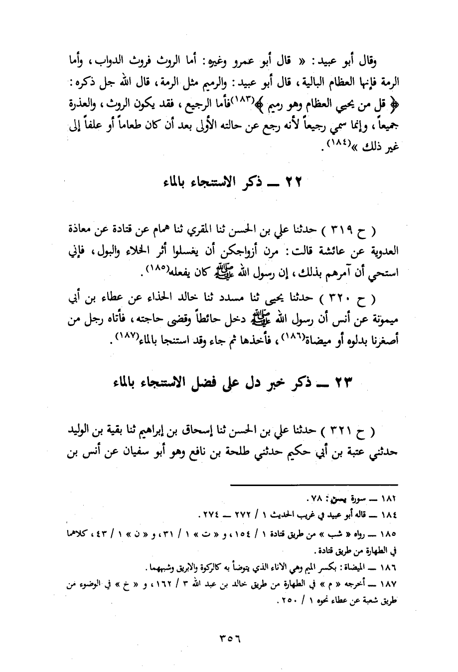 319 - حَدَّثَنَا عَلِيُّ بْنُ الْحَسَنِ، ثنا الْمُقْرِئُ، ثنا هَمَّامٌ، عَنْ قَتَادَةَ، عَنْ مُعَاذَةَ الْعَدَوِيَّةِ، عَنْ عَائِشَةَ، قَالَتْ: مُرْنَ أَزْوَاجَكُنَّ أَنْ يَغْسِلُوا أَثَرَ الْخَلَاءِ وَالْبَوْلِ، فَإِنِّي أَسْتَحِي أَنْ آمُرُهُمْ بِذَلِكَ، إِنَّ رَسُولَ اللهِ صَلَّى اللَّهُ عَلَيْهِ وَسَلَّمَ كَانَ يَفْعَلُهُ