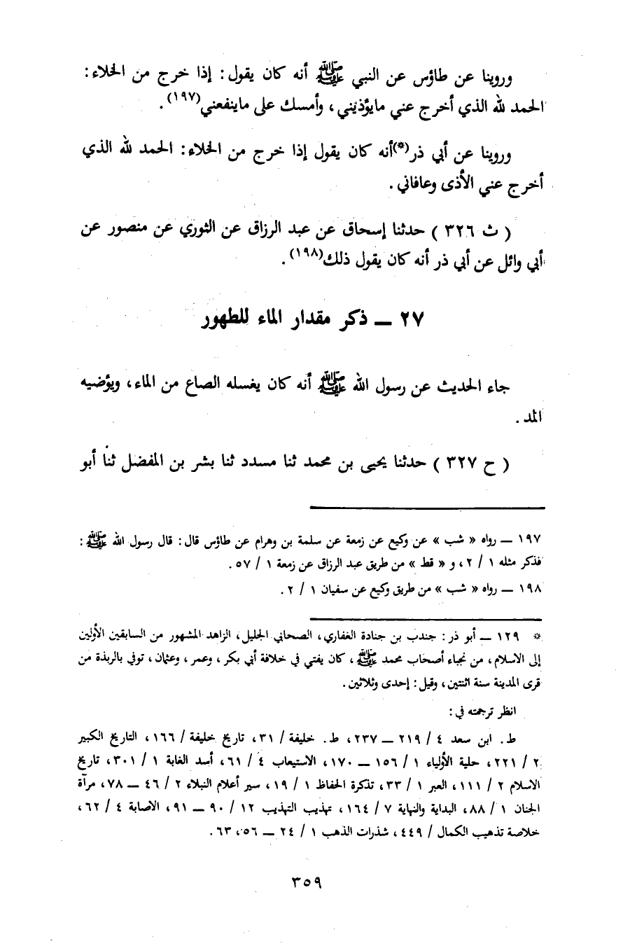 327 - حَدَّثَنَا يَحْيَى بْنُ مُحَمَّدٍ، ثنا مُسَدَّدٌ، ثنا بِشْرُ بْنُ الْمُفَضَّلِ، ثنا أَبُو -[360]- رَيْحَانَةَ، ثنا سَفِينَةُ، مَوْلَى أُمِّ سَلَمَةَ، قَالَ: كَانَ رَسُولُ اللهِ صَلَّى اللَّهُ عَلَيْهِ وَسَلَّمَ يُغَسِّلُهُ الصَّاعُ مِنَ الْمَاءِ وَيُوَضِّئُهُ الْمُدُّ وَقَدْ رُوِّينَا فِي هَذَا الْبَابِ أَخْبَارًا سِوَى هَذَا الْخَبَرِ، وَقَدْ ذَكَرْتُهَا فِي كِتَابِ السُّنَنِ، وَفِي الْكِتَابِ الَّذِي اخْتَصَرْتُ مِنْهُ هَذَا الْكِتَابَ