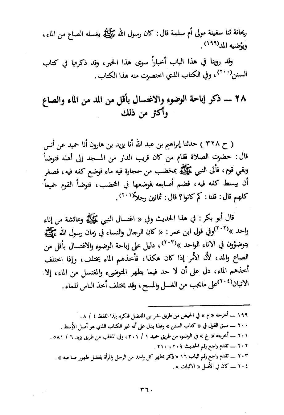328 - حَدَّثَنَا إِبْرَاهِيمُ بْنُ عَبْدِ اللهِ، أنا يَزِيدُ بْنُ هَارُونَ، أنا حُمَيْدٌ، عَنْ أَنَسٍ قَالَ: حَضَرِتِ الصَّلَاةُ فَقَامَ مَنْ كَانَ قَرِيبَ الدَّارِ مِنَ الْمَسْجِدِ إِلَى أَهْلِهِ فَتَوَضَّأَ، وَبَقِيَ قَوْمٌ فَأُتِيَ النَّبِيُّ صَلَّى اللَّهُ عَلَيْهِ وَسَلَّمَ بِمِخْضَبٍ مِنْ حِجَارَةٍ، فِيهِ مَاءٌ فَوَضَعَ كَفَّهُ فِيهِ، فَصَغُرَ أَنْ يَبْسُطَ كَفَّهُ فِيهِ فَضَمَّ أَصَابِعَهُ، فَوَضَعَهَا فِي الْمِخْضَبِ فَتَوَضَّأَ الْقَوْمُ جَمِيعًا كُلُّهُمْ، قَالَ: قُلْنَا: كَمْ كَانُوا؟ قَالَ: ثَمَانِينَ رَجُلًا قَالَ أَبُو بَكْرٍ: فِي هَذَا الْحَدِيثِ وَفِي اغْتِسَالِ النَّبِيِّ صَلَّى اللَّهُ عَلَيْهِ وَسَلَّمَ وَعَائِشَةَ مِنْ إِنَاءٍ وَاحِدٍ، وَفِي قَوْلِ ابْنِ عُمَرَ كَانَ الرِّجَالُ وَالنِّسَاءُ فِي زَمَانِ رَسُولِ اللهِ صَلَّى اللَّهُ عَلَيْهِ وَسَلَّمَ يَتَوَضَّئُونَ فِي الْإِنَاءِ الْوَاحِدِ، دَلِيلٌ عَلَى إِبَاحَةِ الْوُضُوءِ، وَالِاغْتِسَالِ بِأَقَلَّ مِنَ الصَّاعِ وَالْمُدِّ؛ لِأَنَّ الْأَمْرَ إِذَا كَانَ هَكَذَا فَأَخْذُهُمُ الْمَاءَ يَخْتَلِفُ وَإِذَا اخْتَلَفَ أَخْذُهُمُ الْمَاءَ دَلَّ عَلَى أَنْ لَا حَدَّ فِيمَا يُطَهِّرُ الْمُتَوَضِّئَ وَالْمُغْتَسِلَ مِنَ الْمَاءِ إِلَّا الْإِتْيَانُ عَلَى مَا يَجِبُ مِنَ الْغُسْلِ وَالْمَسْحِ، وَقَدْ يَخْتَلِفُ أَخْذُ النَّاسِ لِلْمَاءِ. -[361]- وَقَدِ أَجْمَعَ أَهْلُ الْعِلْمِ عَلَى أَنَّ الْمُدَّ مِنَ الْمَاءِ فِي الْوُضُوءِ، وَالصَّاعَ فِي الِاغْتِسَالِ غَيْرُ لَازِمٌ لِلنَّاسِ، وَكَانَ الشَّافِعِيُّ يَقُولُ: وَقَدْ يَرْفُقُ بِالْمَاءِ الْقَلِيلِ فَيَكْفِي، وَيُخْرَقُ بِالْكَثِيرِ فَلَا يَكْفِي، وَصَدَّقَ الشَّافِعِيُّ هَذَا النَّصَّ، قَالَ: مَوْجُودٌ مِنْ أَفْعَالِ النَّاسِ