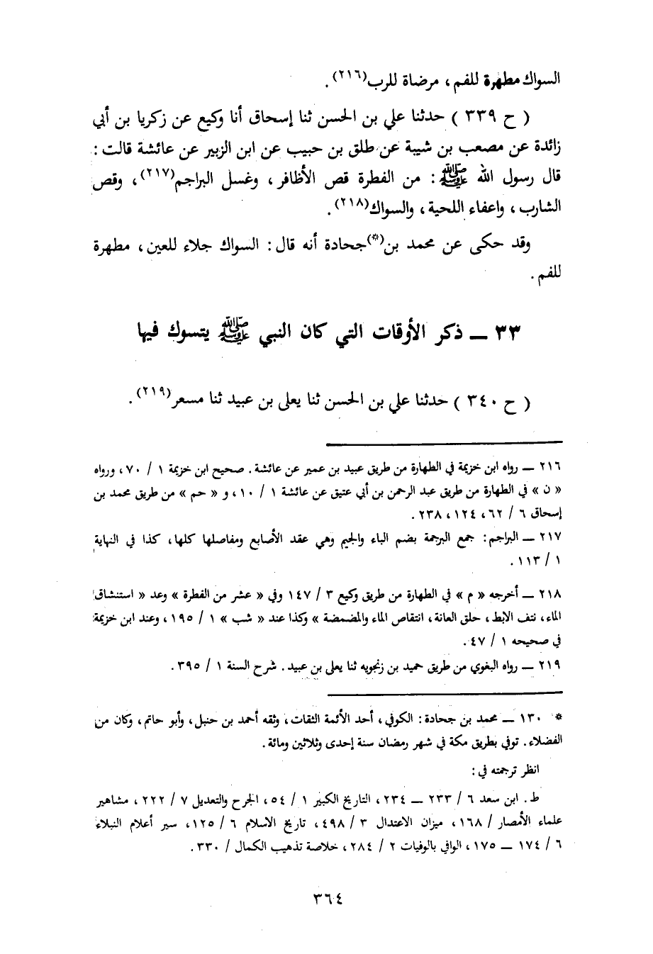 339 - حَدَّثَنَا عَلِيُّ بْنُ الْحَسَنِ، ثنا إِسْحَاقُ، أنا وَكِيعٌ، عَنْ زَكَرِيَّا بْنِ أَبِي زَائِدَةَ، عَنْ مُصْعَبِ بْنِ شَيْبَةَ، عَنْ طَلْقِ بْنِ حَبِيبٍ، عَنِ ابْنِ الزُّبَيْرِ، عَنْ عَائِشَةَ، قَالَتْ: قَالَ رَسُولُ اللهِ صَلَّى اللَّهُ عَلَيْهِ وَسَلَّمَ: «مِنَ الْفِطْرَةِ قَصُّ الْأَظَافِرِ وَغَسْلُ الْبَرَاجِمِ وَقَصُّ الشَّارِبِ وَإِعْفَاءُ اللِّحْيَةِ وَالسِّوَاكُ» وَقَدْ حُكِيَ عَنْ مُحَمَّدِ بْنِ جُحَادَةَ أَنَّهُ قَالَ: السِّوَاكُ جَلَاءٌ لِلْعَيْنِ مَطْهَرَةٌ لِلْفَمِ