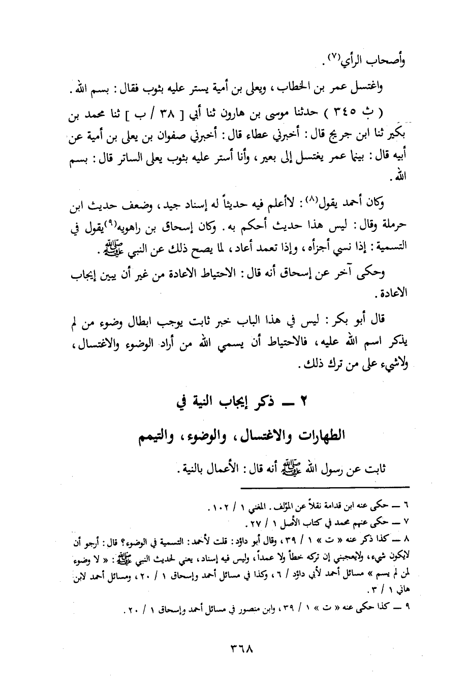 345 - حَدَّثَنَا مُوسَى بْنُ هَارُونَ، ثنا أَبِي، ثنا مُحَمَّدُ بْنُ بُكَيْرٍ، ثنا ابْنُ جُرَيْجٍ، قَالَ: أَخْبَرَنِي عَطَاءٌ، قَالَ: أَخْبَرَنِي صَفْوَانُ بْنُ يَعْلَى بْنِ أُمَيَّةَ، عَنْ أَبِيهِ، قَالَ: بَيْنَمَا عُمَرُ يَغْتَسِلُ إِلَى بَعِيرٍ وَأَنَا أَسْتَرُ، عَلَيْهِ بِثَوْبِ يَعْلَى السَّاتِرِ قَالَ: «بِسْمِ اللهِ» وَكَانَ أَحْمَدُ يَقُولُ: لَا أَعْلَمُ فِيهِ حَدِيثًا لَهُ إِسْنَادٌ جَيِّدٌ، وَضَعَّفَ حَدِيثَ ابْنِ حَرْمَلَةَ وَقَالَ: لَيْسَ هَذَا حَدِيثٌ أَحْكُمُ بِهِ وَكَانَ إِسْحَاقُ بْنُ رَاهَوَيْهِ يَقُولُ فِي التَّسْمِيَةِ إِذَا نَسِيَ: أَجْزَأَهُ وَإِذَا تَعَمَّدَ أَعَادَ لِمَا يَصِحُّ ذَلِكَ عَنِ النَّبِيِّ صَلَّى اللَّهُ عَلَيْهِ وَسَلَّمَ وَحَكَى آخَرُ عَنْ إِسْحَاقَ أَنَّهُ قَالَ: الِاحْتِيَاطُ الْإِعَادَةُ مِنْ غَيْرِ أَنْ يُبَيِّنَ إِيجَابَ الْإِعَادَةِ قَالَ أَبُو بَكْرٍ: لَيْسَ فِي هَذَا الْبَابِ خَبَرٌ ثَابِتٌ يُوجِبُ إِبْطَالَ وُضُوءِ مَنْ لَمْ يَذْكُرِ اسْمَ اللهِ عَلَيْهِ فَالِاحْتِيَاطُ أَنْ يُسَمِّيَ اللهَ مَنْ أَرَادَ الْوُضُوءَ وَالِاغْتِسَالَ وَلَا شَيْءَ عَلَى مَنْ تَرَكَ ذَلِكَ