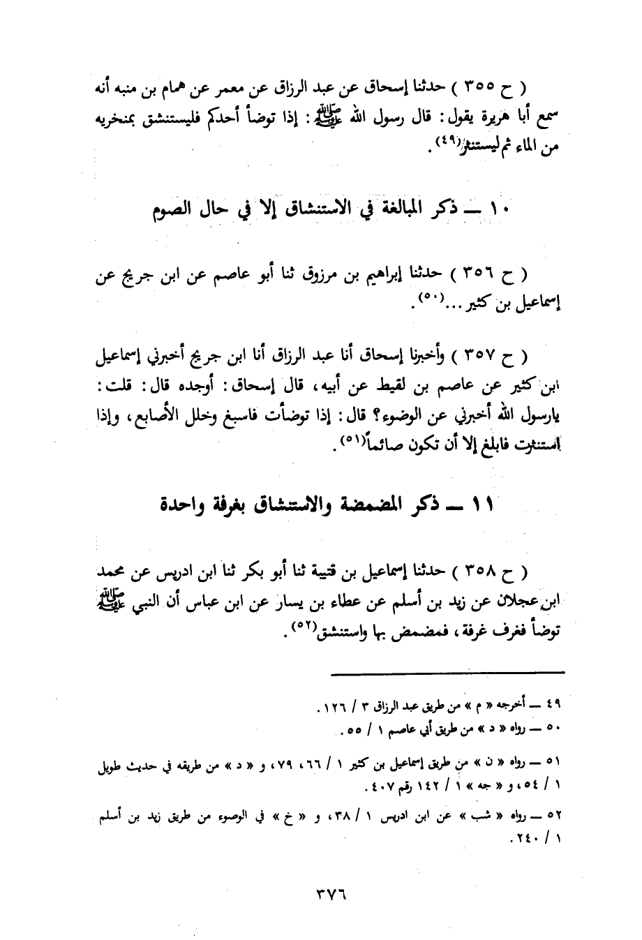 357 - وَأَخْبَرَنَا إِسْحَاقُ، أنا عَبْدُ الرَّزَّاقِ، أنا ابْنُ جُرَيْجٍ، أَخْبَرَنِي إِسْمَاعِيلُ بْنُ كَثِيرٍ، عَنْ عَاصِمِ بْنِ لَقِيطٍ، عَنْ أَبِيهِ، قَالَ إِسْحَاقُ: أَوْ جَدِّهِ، قَالَ: قُلْتُ: يَا رَسُولَ اللهِ، أَخْبِرْنِي عَنِ الْوُضُوءِ قَالَ: «إِذَا تَوَضَّأْتَ فَأَسْبِغْ وَخَلِّلِ الْأَصَابِعَ وَإِذَا اسْتَنْثَرْتَ فَأَبْلِغْ إِلَّا أَنْ تَكُونَ صَائِمًا»