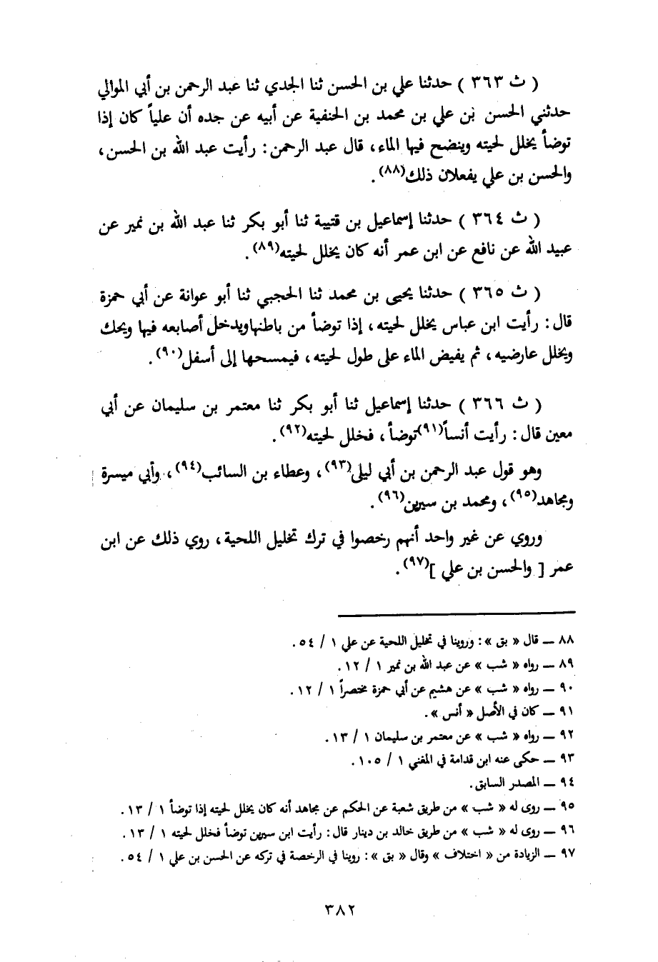 364 - حَدَّثَنَا إِسْمَاعِيلُ بْنُ قُتَيْبَةَ، ثنا أَبُو بَكْرٍ، ثنا عَبْدُ اللهِ بْنُ نُمَيْرٍ، عَنْ عُبَيْدِ اللهِ، عَنْ نَافِعٍ، عَنِ ابْنِ عُمَرَ، أَنَّهُ كَانَ يُخَلِّلُ لِحْيَتِهِ
