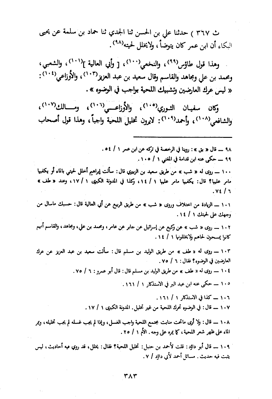 367 - حَدَّثَنَا عَلِيُّ بْنُ الْحَسَنِ، ثنا الْجُدِّيُّ، ثنا حَمَّادُ بْنُ سَلَمَةَ، عَنْ يَحْيَى الْبَكَّاءِ , أَنَّ ابْنَ عُمَرَ، كَانَ يَتَوَضَّأُ وَلَا يُخَلِّلُ لِحْيَتَهُ وَهَذَا قَوْلُ طَاوُسٍ وَالنَّخَعِيِّ وَأَبِي الْعَالِيَةِ وَالشَّعْبِيِّ وَمُحَمَّدِ بْنِ عَلِيٍّ وَمُجَاهِدٍ وَالْقَاسِمِ. وَقَالَ سَعِيدُ بْنُ عَبْدِ الْعَزِيزِ وَالْأَوْزَاعِيُّ: لَيْسَ عَرْكُ الْعَارِضَيْنِ وَتَشْبِيكُ اللِّحْيَةِ بِوَاجِبٍ فِي الْوُضُوءِ، وَكَانَ سُفْيَانُ الثَّوْرِيُّ وَالْأَوْزَاعِيُّ وَمَالِكٌ وَالشَّافِعِيُّ وَأَحْمَدُ لَا يَرَوْنَ تَخْلِيلَ اللِّحْيَةِ وَاجِبًا وَهَذَا قَوْلُ أَصْحَابِ -[384]- الرَّأْيِ وَعَوَامِّ أَهْلِ الْعِلْمِ يَرَوْنَ أَنَّ مَا مَرَّ عَلَى ظَاهِرِ اللِّحْيَةِ مِنَ الْمَاءِ يَكْفِي وَأَوْجَبَتْ طَائِفَةٌ بَلَّ أُصُولِ شَعْرِ اللِّحْيَةِ، وَأَوْجَبَ بَعْضُهُمْ غَسْلَ بَشْرَةِ مَوْضِعِ اللِّحْيَةِ، كَانَ عَطَاءُ بْنُ أَبِي رَبَاحٍ يَرَى بَلَّ أُصُولِ شَعْرِ اللِّحْيَةِ وَقَالَ سَعِيدُ بْنُ جُبَيْرٍ: مَا بَالُ الرَّجُلِ يَغْسِلُ لِحْيَتَهُ مِنْ قَبْلِ أَنْ يَنْبُتَ، فَإِذَا نَبَتَتْ تَرَكَهَا وَلَمْ يَغْسِلْهَا وَكَانَ أَبُو ثَوْرٍ يُوجِبُ الْإِعَادَةَ عَلَى مَنْ تَرَكَ غَسْلَ أُصُولِ الشَّعْرِ، وَكَانَ إِسْحَاقُ يَقُولُ: إِذَا تَرَكَ التَّخْلِيلَ عَامِدًا أَعَادَ. قَالَ أَبُو بَكْرٍ: غَسْلٌ مِنْ تَحْتِ شَعْرِ اللِّحْيَةِ فِي الْوُضُوءِ غَيْرُ وَاجِبٍ، إِذْ لَا حُجَّةَ تَدُلُّ عَلَى إِيجَابِ ذَلِكَ بَلِ الْخَبَرُ وَالنَّظَرُ يَدُلَّانِ عَلَى أَنَّ ذَلِكَ غَيْرَ وَاجِبٍ فَأَمَّا الْخَبَرُ فَقَدْ ثَبَتَ أَنَّ رَسُولَ اللهِ صَلَّى اللَّهُ عَلَيْهِ وَسَلَّمَ تَوَضَّأَ مَرَّةً مَرَّةً يَغْرِفُ غَرْفَةً لِكُلِّ عُضْوٍ