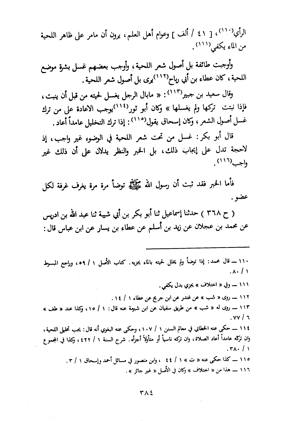 368 - حَدَّثَنَا إِسْمَاعِيلُ، ثنا أَبُو بَكْرِ بْنُ أَبِي شَيْبَةَ، ثنا عَبْدُ اللهِ بْنُ إِدْرِيسَ، عَنْ مُحَمَّدِ بْنِ عَجْلَانَ، عَنْ زَيْدِ بْنِ أَسْلَمَ، عَنْ عَطَاءِ بْنِ يَسَارٍ، عَنِ ابْنِ عَبَّاسٍ، قَالَ: -[385]- تَوَضَّأَ رَسُولُ اللهِ صَلَّى اللَّهُ عَلَيْهِ وَسَلَّمَ فَغَرَفَ غَرْفَةً فَغَسَلَ وَجْهَهُ ثُمَّ غَرَفَ غَرْفَةً فَغَسَلَ يَدَهُ الْيُمْنَى. وَذَكَرَ الْحَدِيثَ وَكَانَ رَسُولُ اللهِ صَلَّى اللَّهُ عَلَيْهِ وَسَلَّمَ عَظِيمَ اللِّحْيَةِ