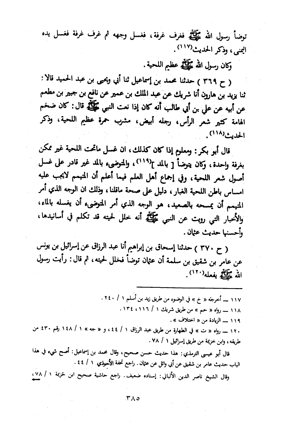 369 - حَدَّثَنَا مُحَمَّدُ بْنُ إِسْمَاعِيلَ، ثنا أَبِي , وَيَحْيَى بْنُ عَبْدِ الْحَمِيدِ، قَالَا: ثنا يَزِيدُ بْنُ هَارُونَ، أنا شَرِيكٌ، عَنْ عَبْدِ الْمَلِكِ بْنِ عُمَيْرٍ، عَنْ نَافِعِ بْنِ جُبَيْرِ بْنِ مُطْعِمٍ، عَنْ أَبِيهِ، عَنْ عَلِيِّ بْنِ أَبِي طَالِبٍ، أَنَّهُ كَانَ إِذَا نَعَتَ النَّبِيَّ صَلَّى اللَّهُ عَلَيْهِ وَسَلَّمَ قَالَ: كَانَ ضَخْمَ الْهَامَةِ كَثِيرَ شَعْرِ الرَّأْسِ رَجْلَةً، أَبْيَضَ مُشَرَّبًا حُمْرَةً، عَظِيمَ اللِّحْيَةِ , وَذَكَرَ الْحَدِيثَ. قَالَ أَبُو بَكْرٍ: وَمَعْلُومٌ إِذَا كَانَ كَذَلِكَ أَنَّ غَسْلَ مَا تَحْتَ اللِّحْيَةِ غَيْرُ مُمْكِنٌ بِغَرْفَةٍ وَاحِدَةٍ وَكَانَ يَتَوَضَّأُ بِالْمُدِّ وَالْمُتَوَضِّئُ بِالْمُدِّ غَيْرُ قَادِرٍ عَلَى غَسْلِ أُصُولِ شَعْرِ اللِّحْيَةِ، وَفِي إِجْمَاعِ أَهْلِ الْعِلْمِ فِيمَا أَعْلَمُ أَنَّ الْمُتَيَمِّمَ لَا يَجِبُ عَلَيْهِ إِمْسَاسُ بَاطِنِ اللِّحْيَةِ الْغُبَارَ، دَلِيلٌ عَلَى صِحَّةِ مَا قُلْنَا، وَذَلِكَ أَنَّ الْوَجْهَ الَّذِي أُمِرَ الْمُتَيَمِّمُ أَنْ يَمْسَحَهُ بِالصَّعِيدِ هُوَ الْوَجْهُ الَّذِي أُمِرَ الْمُتَوَضِّئُ أَنْ يَغْسِلَهُ بِالْمَاءِ، وَالْأَخْبَارُ الَّتِي رُوِيَتْ عَنِ النَّبِيِّ صَلَّى اللَّهُ عَلَيْهِ وَسَلَّمَ أَنَّهُ خَلَّلَ لِحْيَتَهُ قَدْ تُكُلِّمَ فِي أَسَانِيدِهَا، وَأَحْسَنُهَا حَدِيثُ عُثْمَانَ