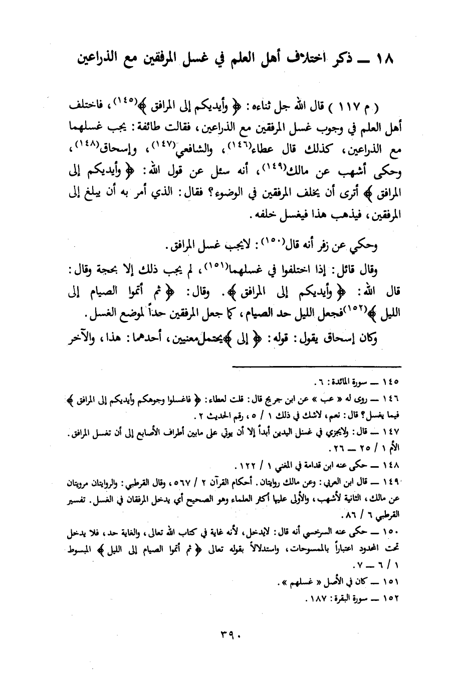 ذِكْرُ اخْتِلَافِ أَهْلِ الْعِلْمِ فِي غَسْلِ الْمِرْفَقَيْنِ مَعَ الذِّرَاعَيْنِ قَالَ اللهُ جَلَّ ثَنَاؤُهُ {وَأَيْدِيَكُمْ إِلَى الْمَرَافِقِ} [المائدة: 6] فَاخْتَلَفَ أَهْلُ الْعِلْمِ فِي وُجُوبِ غَسْلِ الْمِرْفَقَيْنِ مَعَ الذِّرَاعَيْنِ، فَقَالَتْ طَائِفَةٌ: يَجِبُ غَسْلُهُمَا مَعَ الذِّرَاعَيْنِ، كَذَلِكَ قَالَ عَطَاءٌ وَالشَّافِعِيُّ وَإِسْحَاقُ، وَحَكَى أَشْهَبُ عَنْ مَالِكٍ أَنَّهُ سُئِلَ عَنْ قَوْلِ اللهِ {وَأَيْدِيَكُمْ إِلَى الْمَرَافِقِ} [المائدة: 6] أَتَرَى أَنْ يُخَلِّفَ الْمِرْفَقَيْنِ فِي الْوُضُوءِ؟ فَقَالَ: الَّذِي أُمِرَ بِهِ أَنْ يَبْلُغَ إِلَى الْمِرْفَقَيْنِ فَيَذْهَبُ هَذَا فَيَغْسِلُ خَلْفَهُ، وَحُكِيَ عَنْ زُفَرَ أَنَّهُ قَالَ: لَا يَجِبُ غَسْلُ الْمَرَافِقِ، وَقَالَ قَائِلٌ: إِذَا اخْتَلَفُوا فِي غَسْلِهِمَا لَمْ يَجِبْ ذَلِكَ إِلَّا بِحُجَّةٍ، وَقَالَ: قَالَ اللهُ {وَأَيْدِيَكُمْ إِلَى الْمَرَافِقِ} [المائدة: 6] وَقَالَ: {ثُمَّ أَتِمُّوا الصِّيَامَ إِلَى اللَّيْلِ} [البقرة: 187] فَجَعَلَ اللَّيْلَ حَدَّ الصِّيَامِ كَمَا جَعَلَ الْمِرْفَقَيْنِ حَدًّا لِمَوْضِعِ الْغُسْلِ، وَكَانَ إِسْحَاقُ يَقُولُ: قَوْلُهُ: إِلَى يَحْتَمِلُ مَعْنَيَيْنِ: أَحَدُهُمَا هَذَا وَالْآخَرُ