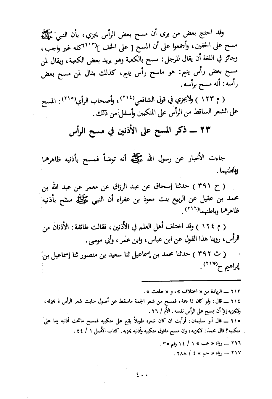 391 - حَدَّثَنَا إِسْحَاقُ، عَنْ عَبْدِ الرَّزَّاقِ، عَنْ مَعْمَرٍ، عَنْ عَبْدِ اللهِ بْنِ مُحَمَّدِ بْنِ عَقِيلٍ، عَنِ الرُّبَيِّعِ بِنْتِ مُعَوِّذِ بْنِ عَفْرَاءَ، أَنَّ النَّبِيَّ صَلَّى اللَّهُ عَلَيْهِ وَسَلَّمَ مَسَحَ بِأُذُنَيْهِ ظَاهِرَهُمَا وَبَاطِنَهُمَا. وَقَدِ اخْتَلَفَ أَهْلُ الْعِلْمِ فِي الْأُذُنَيْنِ فَقَالَتْ طَائِفَةٌ: الْأُذُنَانِ مِنَ الرَّأْسِ رُوِّينَا هَذَا الْقَوْلَ عَنِ ابْنِ عَبَّاسٍ وَابْنِ عُمَرَ وَأَبِي مُوسَى