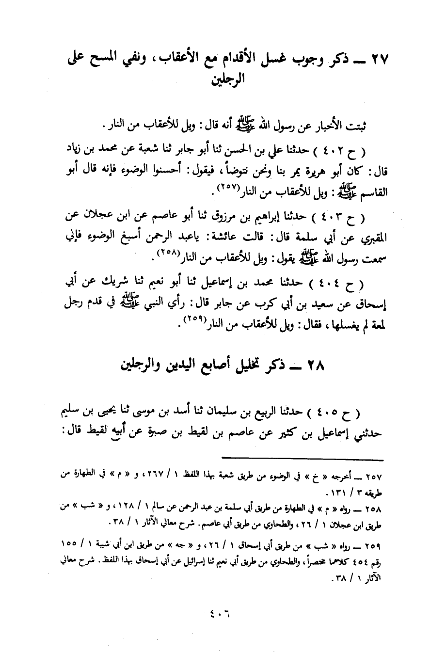 404 - حَدَّثَنَا مُحَمَّدُ بْنُ إِسْمَاعِيلَ، ثنا أَبُو نُعَيْمٍ، ثنا شَرِيكُ، عَنْ أَبِي إِسْحَاقَ، عَنْ سَعِيدِ بْنِ أَبِي كَرِبٍ، عَنْ جَابِرٍ، قَالَ: رَأَى النَّبِيُّ صَلَّى اللَّهُ عَلَيْهِ وَسَلَّمَ فِي قَدَمِ رَجُلٍ لُمْعَةً لَمْ يَغْسِلْهَا فَقَالَ: «وَيْلٌ لِلْأَعْقَابِ مِنَ النَّارِ»