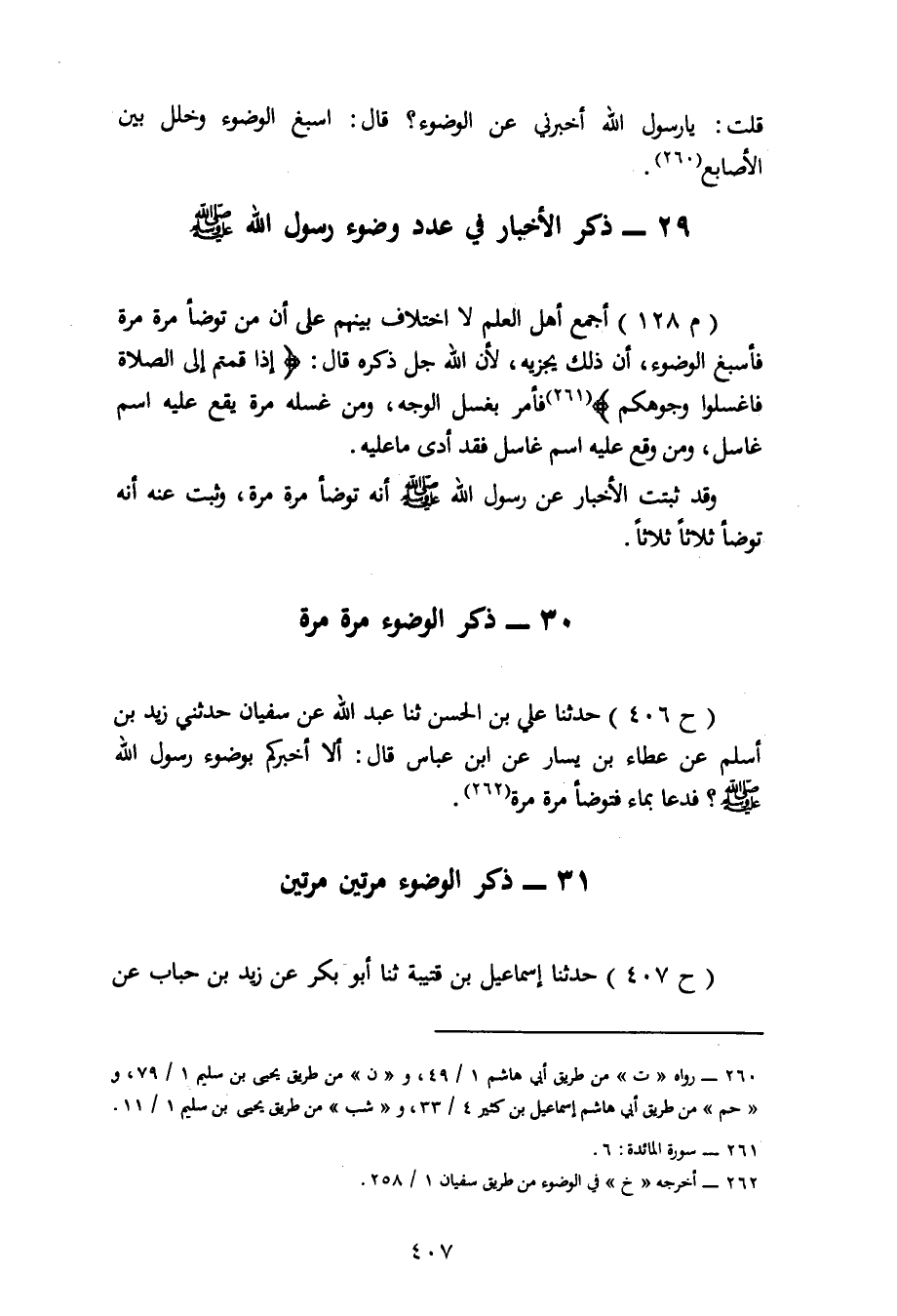 407 - حَدَّثَنَا إِسْمَاعِيلُ بْنُ قُتَيْبَةَ، ثنا أَبُو بَكْرٍ، عَنْ زَيْدِ بْنِ حُبَابٍ، عَنْ -[408]- عَبْدِ الرَّحْمَنِ بْنِ ثَوْبَانَ، حَدَّثَنِي عَبْدُ اللهِ بْنُ الْفَضْلِ الْهَاشِمِيُّ، عَنْ عَبْدِ الرَّحْمَنِ الْأَعْرَجِ، عَنْ أَبِي هُرَيْرَةَ، قَالَ: رَأَيْتُ النَّبِيَّ صَلَّى اللَّهُ عَلَيْهِ وَسَلَّمَ تَوَضَّأَ مَرَّتَيْنِ مَرَّتَيْنِ