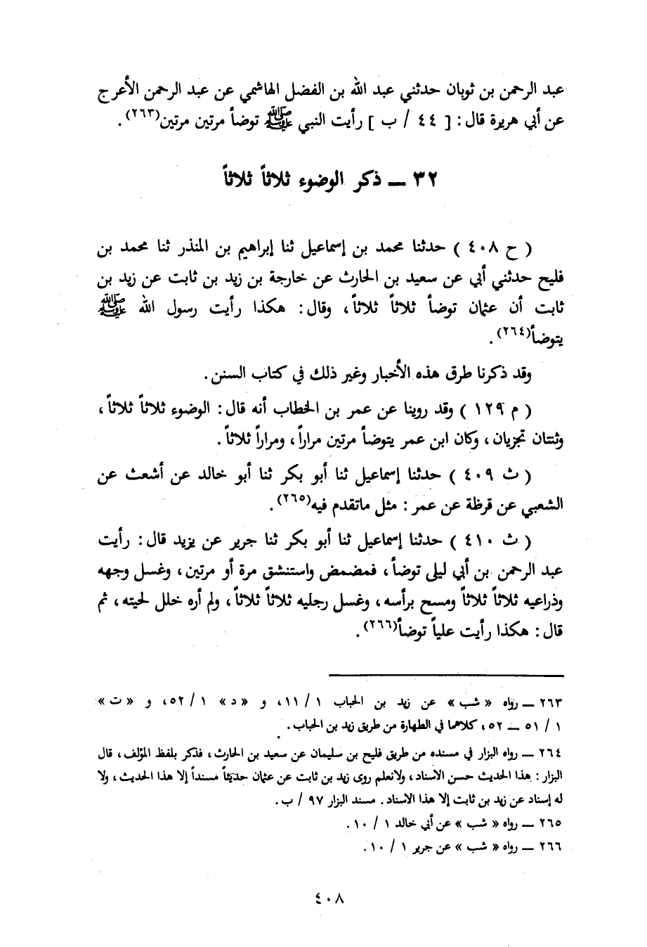 408 - حَدَّثَنَا مُحَمَّدُ بْنُ إِسْمَاعِيلَ، ثنا إِبْرَاهِيمُ بْنُ الْمُنْذِرِ، ثنا مُحَمَّدُ بْنُ فُلَيْحٍ، حَدَّثَنِي أَبِي، عَنْ سَعِيدِ بْنِ الْحَارِثِ، عَنْ خَارِجَةَ بْنِ زَيْدِ بْنِ ثَابِتٍ، عَنْ زَيْدِ بْنِ ثَابِتٍ، أَنَّ عُثْمَانَ، تَوَضَّأَ ثَلَاثًا ثَلَاثًا وَقَالَ: هَكَذَا رَأَيْتُ رَسُولَ اللهِ صَلَّى اللَّهُ عَلَيْهِ وَسَلَّمَ يَتَوَضَّأُ. وَقَدْ ذَكَرْنَا طُرُقَ هَذِهِ الْأَخْبَارِ وَغَيْرَ ذَلِكَ فِي كِتَابِ السُّنَنِ