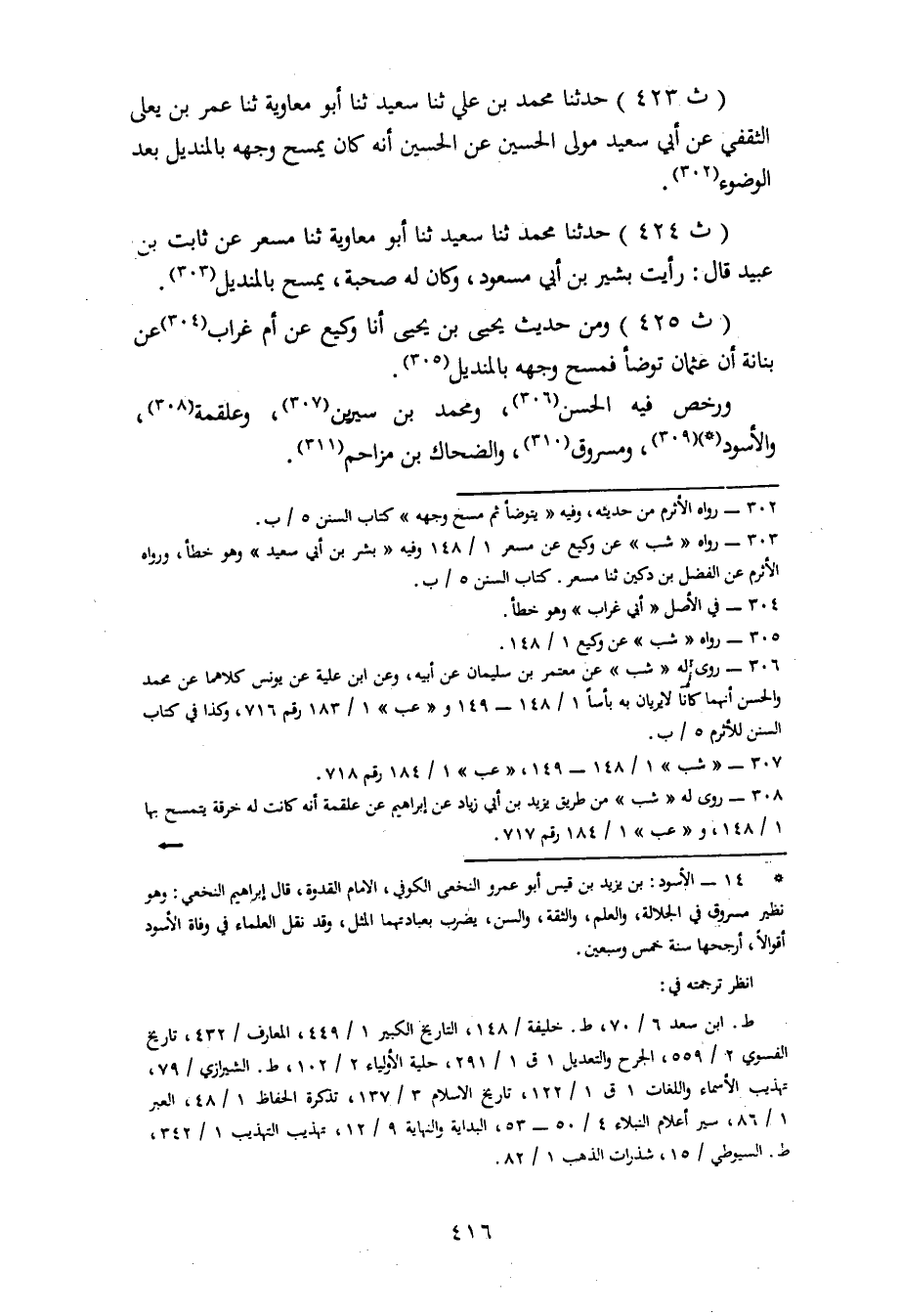 424 - حَدَّثَنَا مُحَمَّدٌ، ثنا سَعِيدٌ، ثنا أَبُو مُعَاوِيَةَ، ثنا مِسْعَرٌ، عَنْ ثَابِتِ بْنِ عُبَيْدٍ، قَالَ: رَأَيْتُ بَشِيرَ بْنَ أَبِي مَسْعُودٍ وَكَانَ لَهُ صُحْبَةٌ، يَمْسَحُ بِالْمِنْدِيلِ