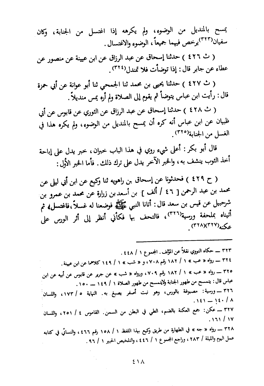 428 - حَدَّثَنَا إِسْحَاقُ، عَنْ عَبْدِ الرَّزَّاقِ، عَنِ الثَّوْرِيِّ، عَنْ قَابُوسَ، عَنْ أَبِي ظَبْيَانَ، عَنِ ابْنِ عَبَّاسٍ، أَنَّهُ كَرِهَ أَنْ يَمْسَحَ، بِالْمِنْدِيلِ مِنَ الْوُضُوءِ وَلَمْ يَكْرَهْ هَذَا فِي الْغُسْلِ مِنَ الْجَنَابَةِ. قَالَ أَبُو بَكْرٍ: أَعْلَى شَيْءٍ رُوِيَ فِي هَذَا الْبَابِ خَبَرَانِ: خَبَرٌ يَدُلُّ عَلَى إِبَاحَةِ أَخْذِ الثَّوْبِ يُنَشِّفُ بِهِ، وَالْخَبَرُ الْآخَرُ يَدُلُّ عَلَى تَرْكِ ذَلِكَ، فَأَمَّا الْخَبَرُ الْأَوَّلُ