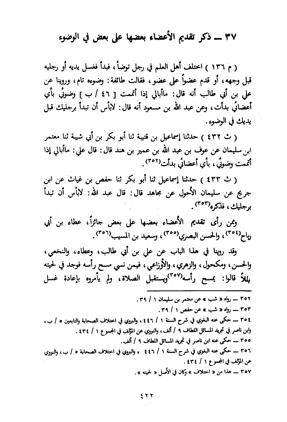432 - حَدَّثَنَا إِسْمَاعِيلُ بْنُ قُتَيْبَةَ، ثنا أَبُو بَكْرِ بْنُ أَبِي شَيْبَةَ، ثنا مُعْتَمِرٌ بْنُ سُلَيْمَانَ، عَنْ عَوْفِ بْنِ عَبْدِ اللهِ بْنِ عُمَيْرِ بْنِ هِنْدَ قَالَ: قَالَ عَلِيٌّ «مَا أُبَالِي إِذَا أَتْمَمْتُ وُضُوئِي بِأَيِّ أَعْضَائِي بَدَأْتُ»