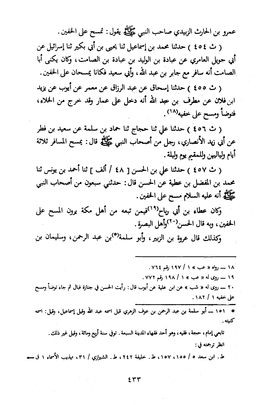 457 - حَدَّثَنَا عَلِيُّ بْنُ الْحَسَنِ، ثنا أَحْمَدُ بْنُ يُونُسَ، ثنا مُحَمَّدُ بْنُ الْفَضْلِ بْنِ عَطِيَّةَ، عَنِ الْحَسَنِ، قَالَ: حَدَّثَنِي سَبْعُونَ مِنْ أَصْحَابِ النَّبِيِّ صَلَّى اللَّهُ عَلَيْهِ وَسَلَّمَ أَنَّهُ عَلَيْهِ السَّلَامُ مَسَحَ عَلَى الْخُفَّيْنِ. وَكَانَ عَطَاءُ بْنُ أَبِي رَبَاحٍ فِيمَنْ تَبِعَهُ مِنْ أَهْلِ مَكَّةِ يَرَوْنَ الْمَسْحَ عَلَى الْخُفَّيْنِ، وَبِهِ قَالَ الْحَسَنُ وَأَهْلُ الْبَصْرَةِ، وَكَذَلِكَ قَالَ عُرْوَةُ بْنُ الزُّبَيْرِ، وَأَبُو سَلَمَةَ بْنُ عَبْدِ الرَّحْمَنِ، وَسُلَيْمَانُ -[434]- بْنُ يَسَارٍ، وَمَنْ تَبِعَهُمْ مِنْ أَهْلِ الْمَدِينَةِ، وَبِهِ قَالَ الشَّعْبِيُّ وَمَنْ وَافَقَهُ مِنْ أَهْلِ الْكُوفَةِ، وَكَذَلِكَ قَالَ مَكْحُولٌ، وَأَهْلُ الشَّامِ، وَبِهِ قَالَ مَالِكُ بْنُ أَنَسٍ، وَالْأَوْزَاعِيُّ، وَسُفْيَانُ الثَّوْرِيُّ، وَالشَّافِعِيُّ، وَأَحْمَدُ، وَإِسْحَاقُ، وَأَبُو ثَوْرٍ، وَأَصْحَابُ الرَّأْيِ، وَأَجْمَعَ كُلُّ مَنْ نَحْفَظُ عَنْهُ مِنْ أَهْلِ الْعِلْمِ، وَكُلُّ مَنْ لَقِيتُ مِنْهُمْ عَلَى الْقَوْلِ بِهِ، وَقَدْ رُوِّينَا عَنِ ابْنِ الْمُبَارَكِ أَنَّهُ قَالَ: لَيْسَ فِي الْمَسْحِ عَلَى الْخُفَّيْنِ اخْتِلَافُ أَنَّهُ جَائِزٌ، قَالَ: وَذَلِكَ أَنَّ كُلَّ مَنْ رُوِيَ عَنْهُ مِنْ أَصْحَابِ النَّبِيِّ صَلَّى اللَّهُ عَلَيْهِ وَسَلَّمَ أَنَّهُ كَرِهَ الْمَسْحَ عَلَى الْخُفَّيْنِ فَقَدْ رَوَى عَنْهُ غَيْرَ ذَلِكَ. قَالَ أَبُو بَكْرٍ: وَإِنَّمَا أَنْكَرَ الْمَسْحَ عَلَى الْخُفَّيْنِ مَنْ أَنْكَرَ الرَّجْمَ وَأَبَاحَ أَنْ تُنْكَحَ الْمَرْأَةُ عَلَى عَمَّتِهَا وَعَلَى خَالَتِهَا، وَأَبَاحَ لِلْمُطَلَّقَةِ ثَلَاثًا الرُّجُوعَ إِلَى الزَّوْجِ الْأَوَّلِ إِذَا نَكَحَهَا الثَّانِي، وَلَمْ يَدْخُلْ بِهَا وَأَسْقَطَ الْجَلْدَ عَمَّنْ قَذَفَ مُحْصَنًا مِنَ الرِّجَالِ، وَإِذَا ثَبَتَ الشَّيْءُ بِالسُّنَّةِ وَجَبَ الْأَخْذُ بِهِ، وَلَمْ يَكُنْ لِأَحَدٍ عُذْرٌ فِي تَرْكِهِ، وَلَا التَّخَلُّفُ عَنْهُ