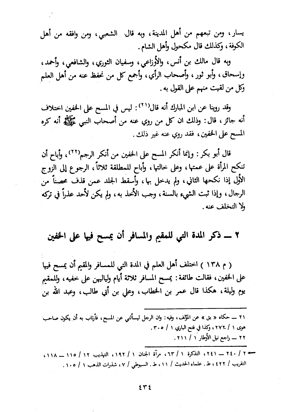 ذِكْرُ الْمُدَّةِ الَّتِي لِلْمُقِيمِ وَالْمُسَافِرِ أَنْ يَمْسَحَ فِيهَا عَلَى الْخُفَّيْنِ اخْتَلَفَ أَهْلُ الْعِلْمِ فِي الْمُدَّةِ الَّتِي لِلْمُسَافِرِ وَالْمُقِيمِ أَنْ يَمْسَحَ فِيهَا عَلَى الْخُفَّيْنِ، فَقَالَتْ طَائِفَةٌ: يَمْسَحُ الْمُسَافِرُ ثَلَاثَةَ أَيَّامٍ وَلَيَالِيهِنَّ عَلَى خُفَّيْهِ، وَلِلْمُقِيمِ يَوْمٌ وَلَيْلَةٌ، هَكَذَا قَالَ عُمَرُ بْنُ الْخَطَّابِ، وَعَلِيُّ بْنُ أَبِي طَالِبٍ، وَعَبْدُ اللهِ بْنُ -[435]- مَسْعُودٍ، وَابْنُ عَبَّاسٍ، وَأَبُو زَيْدٍ الْأَنْصَارِيُّ، وَشُرَيْحٌ، وَعَطَاءُ بْنُ أَبِي رَبَاحٍ، وَبِهِ قَالَ سُفْيَانُ الثَّوْرِيُّ، وَأَصْحَابُ الرَّأْيِ، وَأَحْمَدُ بْنُ حَنْبَلٍ، وَإِسْحَاقُ، وَهُوَ آخِرُ قَوْلِ لِلشَّافِعِيِّ، وَكَانَ قَوْلُهُ الْأَوَّلُ كَقَوْلِ مَالِكٍ