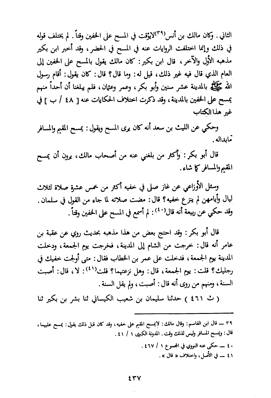 قَالَ أَبُو بَكْرٍ: وَقَدِ احْتَجَّ بَعْضُ مَنْ هَذَا مَذْهَبُهُ بِحَدِيثٍ رُوِيَ عَنْ عُقْبَةَ بْنِ عَامِرٍ أَنَّهُ قَالَ: خَرَجْتُ مِنَ الشَّامِ إِلَى الْمَدِينَةِ، فَخَرَجْتُ يَوْمَ الْجُمُعَةِ، وَدَخَلْتُ الْمَدِينَةَ يَوْمَ الْجُمُعَةِ، فَدَخَلْتُ عَلَى عُمَرَ بْنِ الْخَطَّابِ، فَقَالَ: «مَتَى أَوْلَجْتَ خُفَّيْكَ فِي رِجْلَيْكَ؟» قُلْتُ: يَوْمَ الْجُمُعَةِ، قَالَ: «وَهَلْ نَزَعْتَهُمَا؟» قُلْتُ: لَا، قَالَ: «أَصَبْتَ السُّنَّةَ» ، وَمِنْهُمْ مَنْ رَوَى أَنَّهُ قَالَ: أَصَبْتَ وَلَمْ يَقُلِ السُّنَّةَ
