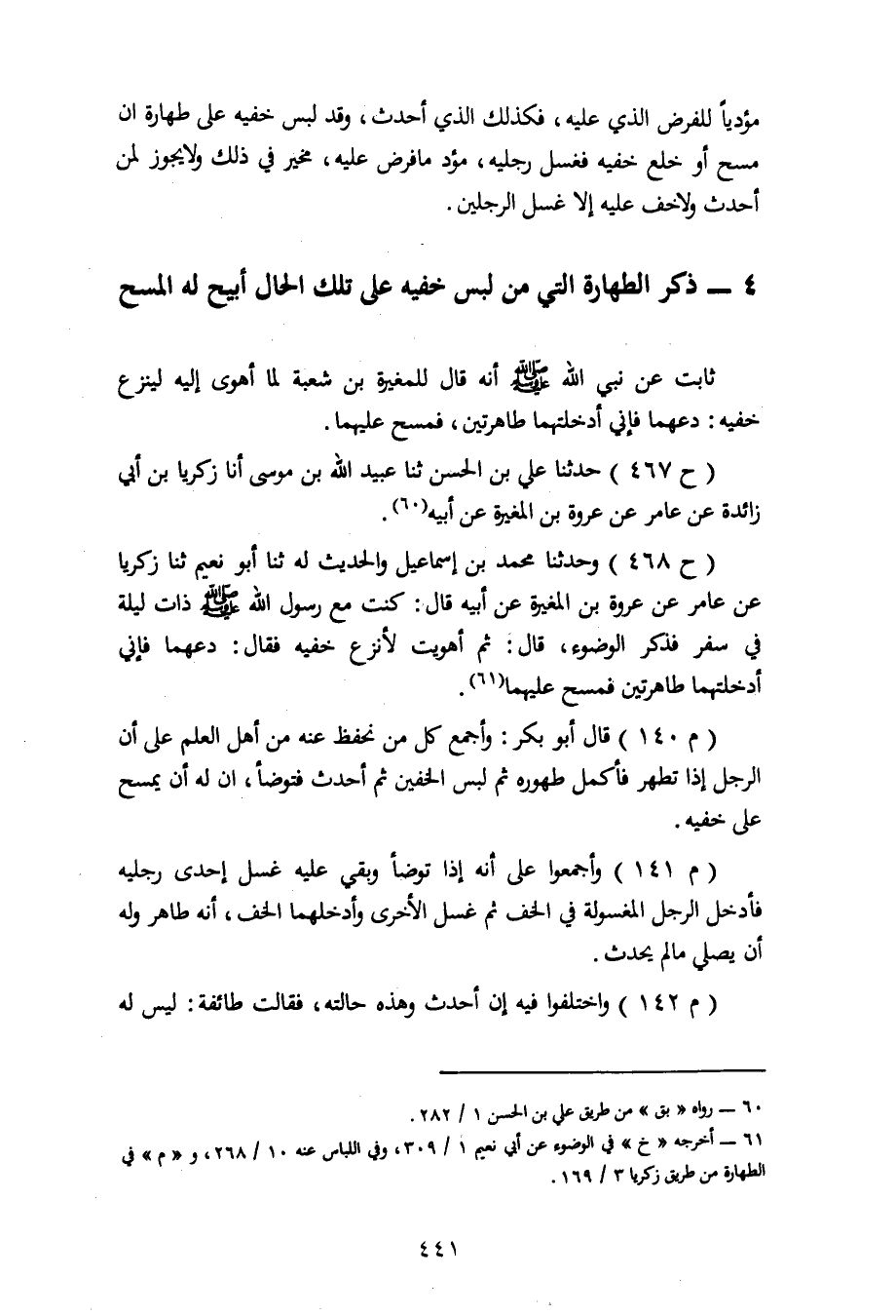 468 - وَحَدَّثَنَا مُحَمَّدُ بْنُ إِسْمَاعِيلَ، وَالْحَدِيثُ لَهُ، ثنا أَبُو نُعَيْمٍ، ثنا زَكَرِيَّا، عَنْ عَامِرٍ، عَنْ عُرْوَةَ بْنِ الْمُغِيرَةِ، عَنْ أَبِيهِ، قَالَ: كُنْتُ مَعَ رَسُولِ اللهِ صَلَّى اللَّهُ عَلَيْهِ وَسَلَّمَ ذَاتَ لَيْلَةٍ فِي سَفَرٍ، فَذَكَرَ الْوُضُوءَ قَالَ: ثُمَّ أَهْوَيْتُ لِأَنْزِعَ خُفَّيْهِ، فَقَالَ: «دَعْهُمَا، فَإِنِّي أَدْخَلْتُهُمَا طَاهِرَتَيْنِ» فَمَسَحَ عَلَيْهِمَا. قَالَ أَبُو بَكْرٍ: وَأَجْمَعَ كُلُّ مَنْ نَحْفَظُ عَنْهُ مِنْ أَهْلِ الْعِلْمِ عَلَى أَنَّ الرَّجُلَ إِذَا تَطَهَّرَ فَأَكْمَلَ طُهُورَهُ، ثُمَّ لَبِسَ الْخُفَّيْنِ، ثُمَّ أَحْدَثَ فَتَوَضَّأَ أَنَّ لَهُ أَنْ يَمْسَحَ عَلَى خُفَّيْهِ، وَأَجْمَعُوا عَلَى أَنَّهُ إِذَا تَوَضَّأَ وَبَقِيَ عَلَيْهِ غَسْلُ إِحْدَى رِجْلَيْهِ، فَأَدْخَلَ الرَّجُلُ الْمَغْسُولَةَ فِي الْخُفِّ، ثُمَّ غَسَلَ الْأُخْرَى، وَأَدْخَلَهُمَا الْخُفَّ أَنَّهُ طَاهِرٌ، وَلَهُ أَنْ يُصَلِّيَ مَا لَمْ يُحْدِثْ. وَاخْتَلَفُوا فِيهِ إِنْ أَحْدَثَ وَهَذِهِ حَالَتُهُ، فَقَالَتْ طَائِفَةٌ: لَيْسَ لَهُ -[442]- أَنْ يَمْسَحَ؛ لِأَنَّهُ أَدْخَلَ إِحْدَى رِجْلَيْهِ الْخُفَّ قَبْلَ أَنْ يُكْمِلَ الطَّهَارَةَ، وَيَحِلُّ لَهُ الصَّلَاةُ هَذَا قَوْلُ الشَّافِعِيِّ، وَأَحْمَدَ، وَإِسْحَاقُ، وَقَالَ مَالِكٌ: إِنَّمَا يَمْسَحُ عَلَى الْخُفَّيْنِ مَنْ أَدْخَلَهُمَا، وَهُمَا طَاهِرَتَانِ، وَفِيهِ قَوْلٌ ثَانٍ، وَهُوَ أَنَّ لِمَنْ هَذِهِ حَالَتُهُ أَنْ يَمْسَحَ عَلَى الْخُفَّيْنِ، هَذَا قَوْلُ يَحْيَى بْنِ آدَمَ، وَبِهِ قَالَ أَبُو ثَوْرٍ، وَأَصْحَابُ الرَّأْيِ، وَالْمُزَنِيُّ، وَبَعْضُ أَصْحَابِنَا، وَقَدِ احْتَجَّ بَعْضُ أَصْحَابِنَا الْقَائِلِينَ بِهَذَا الْقَوْلِ، بِأَنَّ الرَّجُلَ إِذَا غَسَلَ وَجْهَهُ وَيَدَيْهِ، وَمَسَّ بِرَأْسِهِ، وَغَسَلَ إِحْدَى رِجْلَيْهِ، فَقَدْ طَهُرَتْ رِجْلَهُ الَّتِي غَسَلَهَا، فَإِذَا أَدْخَلَهَا الْخُفَّ فَقَدْ أَدْخَلَهَا وَهِيَ طَاهِرَةٌ، ثُمَّ إِذَا غَسَلَ الْأُخْرَى مِنْ سَاعَتِهِ وَأَدْخَلَهَا الْخُفِّ، فَقَدْ أَدْخَلَهَا وَهِيَ طَاهِرَةٌ، فَقَدْ أَدْخَلَ مَنْ هَذِهِ صِفَتُهُ رِجْلَيْهِ الْخُفَّ، وَهُمَا طَاهِرَتَانِ، فَلَهُ أَنْ يَمْسَحَ عَلَيْهِمَا بِظَاهِرِ الْخَبَرِ؛ لِأَنَّهُ قَدْ أَدْخَلَ قَدَمَيْهِ، وَهُمَا طَاهِرَتَانِ، قَالَ وَالْقَائِلُ بِخِلَافِ هَذَا الْقَوْلِ قَائِلٌ بِخِلَافِ الْحَدِيثِ، وَلَيْسَ يَخْلَعَ هَذَا خُفَّيْهِ، ثُمَّ يَلْبَسُهُمَا مَعْنًى