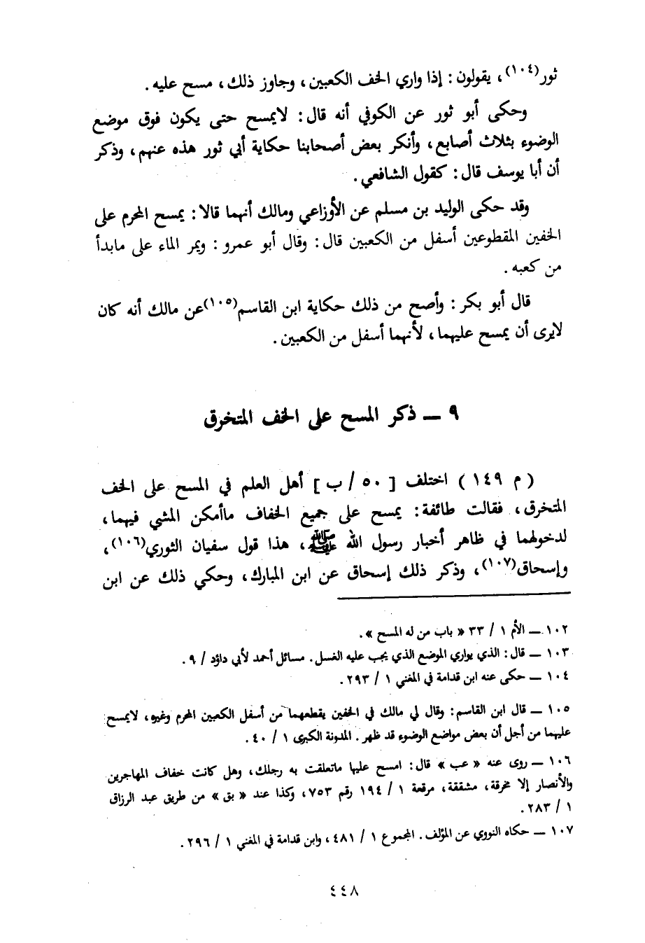 ذِكْرُ الْمَسْحِ عَلَى الْخُفِّ الْمُتَخَرِّقِ اخْتَلَفَ أَهْلُ الْعِلْمِ فِي الْمَسْحِ عَلَى الْخُفِّ الْمُتَخَرِّقِ، فَقَالَتْ طَائِفَةٌ: يَمْسَحُ عَلَى جَمِيعِ الْخِفَافِ مَا أَمْكَنَ الْمَشْيُ فِيهِمَا لِدُخُولِهِمَا فِي ظَاهِرِ أَخْبَارِ رَسُولِ اللهِ صَلَّى اللَّهُ عَلَيْهِ وَسَلَّمَ. هَذَا قَوْلُ سُفْيَانَ الثَّوْرِيِّ، وَإِسْحَاقَ، وَذَكَرَ ذَلِكَ إِسْحَاقُ عَنِ ابْنِ الْمُبَارَكِ، وَحُكِيَ ذَلِكَ عَنِ ابْنِ