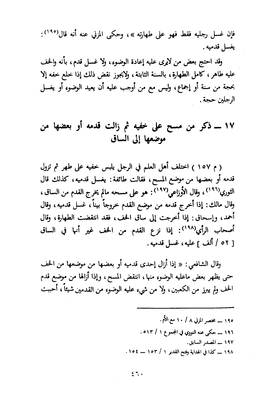 فَإِنْ غَسَلَ رِجْلَيْهِ فَقَطْ فَهُوَ عَلَى طَهَارَتِهِ، وَحَكَى الْمُزَنِيُّ عَنْهُ أَنَّهُ قَالَ: يَغْسِلُ قَدَمَيْهِ، وَقَدِ احْتَجَّ بَعْضُ مَنْ لَا يَرَى عَلَيْهِ إِعَادَةَ الْوُضُوءِ، وَلَا غَسْلَ قَدَمٍ بِأَنَّهُ وَالْخُفُّ عَلَيْهِ طَاهِرٌ كَامِلُ الطَّهَارَةِ بِالسُّنَّةِ الثَّابِتَةِ، وَلَا يَجُوزُ نَقْضُ ذَلِكَ إِذَا خَلَعَ خُفَّهُ إِلَّا بِحُجَّةٍ مِنْ سُنَّةٍ أَوْ إِجْمَاعٍ، وَلَيْسَ مَعَ مَنْ أَوْجَبَ عَلَيْهِ أَنْ يُعِيدَ الْوُضُوءَ أَوْ يَغْسِلَ الرِّجْلَيْنِ حُجَّةً.