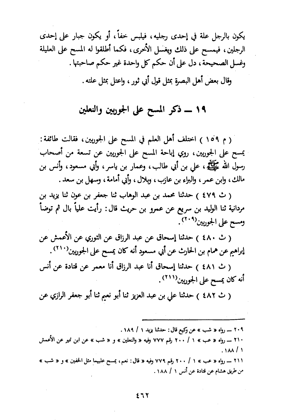 ذِكْرُ الْمَسْحِ عَلَى الْجَوْرَبَيْنِ وَالنَّعْلَيْنِ اخْتَلَفَ أَهْلُ الْعِلْمِ فِي الْمَسْحِ عَلَى الْجَوْرَبَيْنِ فَقَالَتْ طَائِفَةٌ: يَمْسَحُ عَلَى الْجَوْرَبَيْنِ، رُوِيَ إِبَاحَةُ الْمَسْحِ عَلَى الْجَوْرَبَيْنِ عَنْ تِسْعَةٍ مِنْ أَصْحَابِ رَسُولِ اللهِ صَلَّى اللَّهُ عَلَيْهِ وَسَلَّمَ: عَلِيِّ بْنِ أَبِي طَالِبٍ، وَعَمَّارِ بْنِ يَاسِرٍ، وَأَبِي مَسْعُودِ، وَأَنَسِ بْنِ مَالِكٍ، وَابْنِ عُمَرَ، وَالْبَرَاءِ بْنِ عَازِبٍ، وَبِلَالٍ، وَأَبِي أُمَامَةَ، وَسَهْلِ بْنِ سَعْدٍ