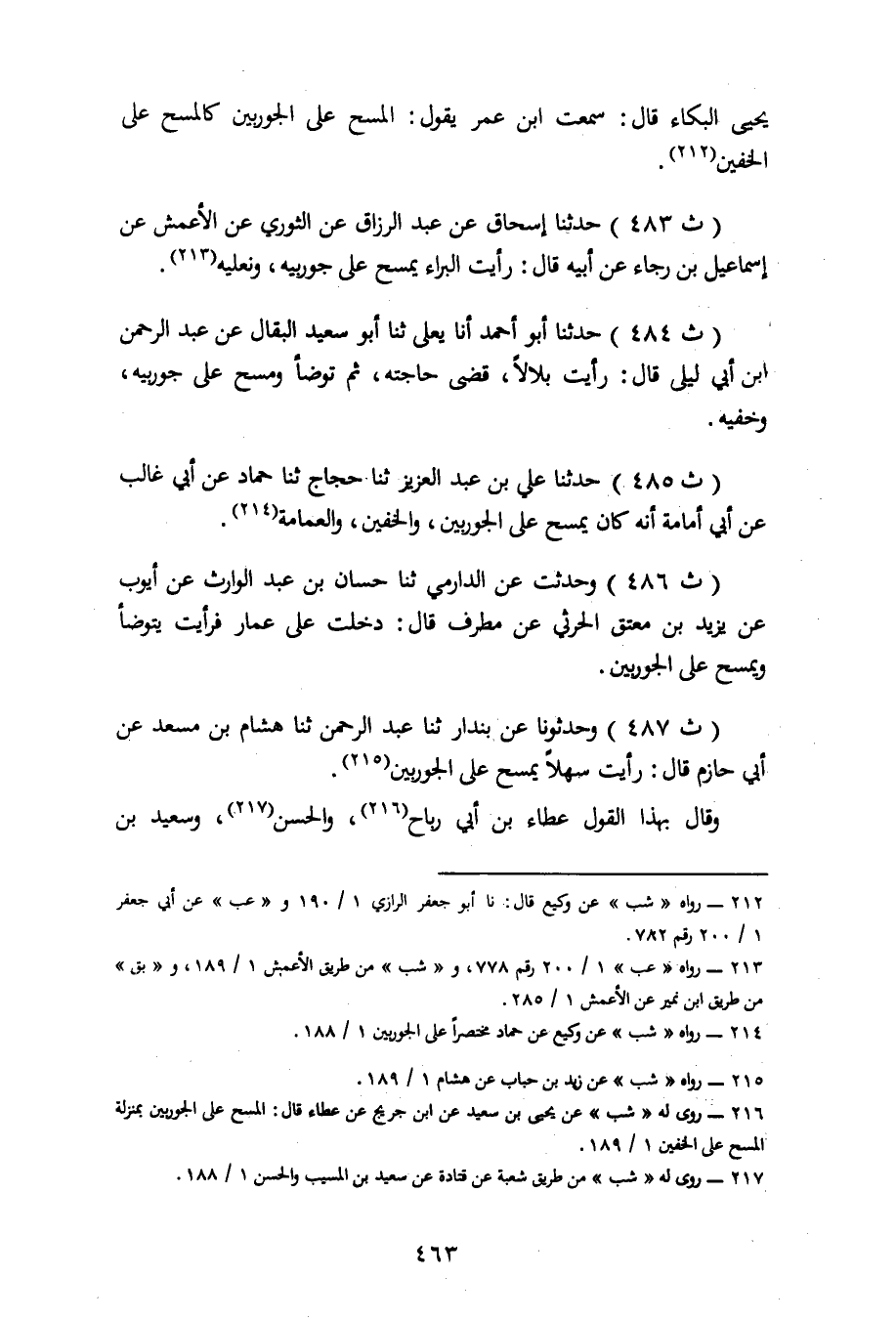 487 - وَحَدَّثُونَا عَنْ بُنْدَارٍ، ثنا عَبْدُ الرَّحْمَنِ، ثنا هِشَامُ بْنُ سَعْدٍ، عَنْ أَبِي حَازِمٍ، قَالَ: رَأَيْتُ سَهْلًا يَمْسَحُ عَلَى الْجَوْرَبَيْنِ وَقَالَ بِهَذَا الْقَوْلِ عَطَاءُ بْنُ أَبِي رَبَاحٍ، وَالْحَسَنُ، وَسَعِيدُ بْنُ -[464]- الْمُسَيِّبِ، كَذَلِكَ قَالَا: إِذَا كَانَا صَفِيقَيْنِ وَبِهِ قَالَ النَّخَعِيُّ، وَسَعِيدُ بْنُ جُبَيْرٍ، وَالْأَعْمَشُ، وَسُفْيَانُ الثَّوْرِيُّ، وَالْحَسَنُ بْنُ صَالِحٍ، وَابْنُ الْمُبَارَكِ، وَزُفَرُ، وَأَحْمَدُ، وَإِسْحَاقُ قَالَ أَحْمَدُ: قَدْ فَعَلَهُ سَبْعَةٌ أَوْ ثَمَانِيَةٌ مِنْ أَصْحَابِ النَّبِيِّ صَلَّى اللَّهُ عَلَيْهِ وَسَلَّمَ، وَقَالَ إِسْحَاقُ: مَضَتِ السُّنَّةُ مِنْ أَصْحَابِ النَّبِيِّ صَلَّى اللَّهُ عَلَيْهِ وَسَلَّمَ، وَمَنْ -[465]- بَعْدَهُمْ مِنَ التَّابِعِينَ فِي الْمَسْحِ عَلَى الْجَوْرَبَيْنِ، لَا اخْتِلَافَ بَيْنَهُمْ فِي ذَلِكَ، وَقَالَ أَبُو ثَوْرٍ: يَمْسَحُ عَلَيْهِمَا إِذَا كَانَا يَمْشِي فِيهِمَا، وَكَذَلِكَ قَالَ يَعْقُوبُ وَمُحَمَّدٌ، إِذَا كَانَا ثَخِينَيْنِ لَا يَشِفَّانِ، وَاحْتَجَّ بَعْضُ مَنْ رَأَى الْمَسْحَ عَلَى الْجَوْرَبَيْنِ بِحَدِيثِ الْمُغِيرَةِ