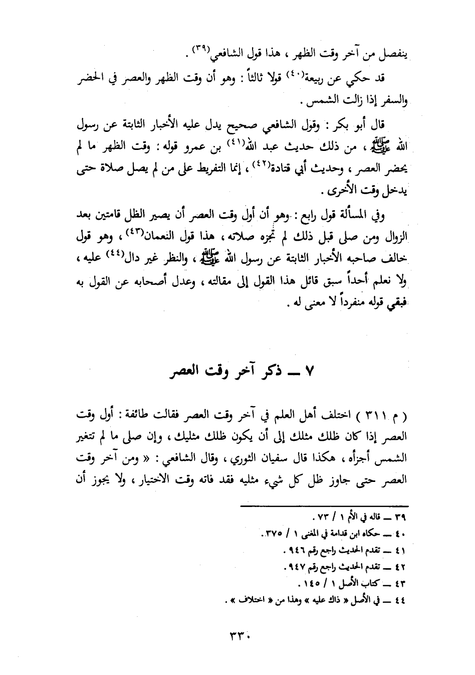 يَنْفَصِلُ مِنْ آخِرِ وَقْتِ الظُّهْرِ هَذَا قَوْلُ الشَّافِعِيِّ، قَدْ حُكِيَ عَنْ رَبِيعَةَ قَوْلًا ثَالِثًا وَهُوَ أَنَّ وَقْتَ الظُّهْرِ وَالْعَصْرِ فِي الْحَضَرِ وَالسَّفَرِ إِذَا زَالَتِ الشَّمْسُ قَالَ أَبُو بَكْرٍ: وَقَوْلُ الشَّافِعِيِّ صَحِيحٌ يَدُلُّ عَلَيْهِ الْأَخْبَارُ الثَّابِتَةُ عَنْ رَسُولِ اللهِ صَلَّى اللَّهُ عَلَيْهِ وَسَلَّمَ مِنْ ذَلِكَ حَدِيثُ عَبْدِ اللهِ بْنِ عَمْرٍو قَوْلُهُ: «وَقْتُ الظُّهْرِ مَا لَمْ يَحْضُرِ الْعَصْرُ» ، وَحَدِيثُ أَبِي قَتَادَةَ: «إِنَّمَا التَّفْرِيطُ عَلَى مَنْ لَمْ يُصَلِّ صَلَاةً حَتَّى يَدْخُلَ وَقْتُ الْأُخْرَى» ، وَفِي الْمَسْأَلَةِ قَوْلٌ رَابِعٌ وَهُوَ أَنَّ أَوَّلَ وَقْتِ الْعَصْرِ أَنْ يَصِيرَ الظِّلُّ قَامَتَيْنِ بَعْدَ الزَّوَالِ وَمَنْ صَلَّى قَبْلَ ذَلِكَ لَمْ تُجْزِهِ صَلَاتُهُ هَذَا قَوْلِ النُّعْمَانِ وَهُوَ قَوْلٌ خَالَفَ صَاحِبُهُ الْأَخْبَارَ الثَّابِتَةَ عَنْ رَسُولِ اللهِ صَلَّى اللَّهُ عَلَيْهِ وَسَلَّمَ وَالنَّظَرُ غَيْرُ دَالٍّ عَلَيْهِ وَلَا نَعْلَمُ أَحَدًا سَبَقَ قَائِلَ هَذَا الْقَوْلِ إِلَى مَقَالَتِهِ وَعَدَلَ أَصْحَابُهُ عَنِ الْقَوْلِ بِهِ فَبَقِيَ قَوْلُهُ مُنْفَرِدًا لَا مَعْنَى لَهُ