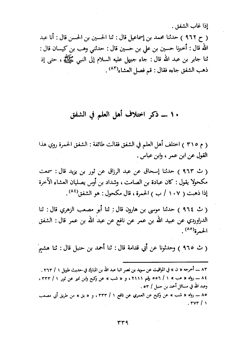 965 - وَحَدَّثُونَا عَنْ أَبِي قُدَامَةَ، قَالَ: ثنا أَحْمَدُ بْنُ حَنْبَلٍ، قَالَ: ثنا هُشَيْمٌ، -[340]- قَالَ: ثنا عَبْدُ الرَّحْمَنِ بْنُ يَحْيَى، عَنْ حَسَّانَ بْنِ أَبِي حَبَلَةَ، عَنِ ابْنِ عَبَّاسٍ، قَالَ: الشَّفَقُ: الْحُمْرَةُ وَكَانَ طَاوُسٌ يُصَلِّي الْعِشَاءَ قَبْلَ أَنْ يَغِيبَ الْبَيَاضُ، وَمِمَّنْ قَالَ بِأَنَّ الشَّفَقَ الْحُمْرَةُ مَالِكُ بْنُ أَنَسٍ وَسُفْيَانُ الثَّوْرِيُّ وَابْنُ أَبِي لَيْلَى وَالشَّافِعِيُّ وَأَحْمَدُ وَإِسْحَاقُ وَأَبُو ثَوْرٍ وَيَعْقُوبُ وَمُحَمَّدٌ وَقَالَتْ طَائِفَةٌ: الشَّفَقُ: الْبَيَاضُ رُوِّينَا عَنْ أَنَسٍ أَنَّهُ كَانَ إِذَا أَرَادَ أَنْ يُصَلِّيَ الْعِشَاءَ قَالَ لِغُلَامٍ لَهُ أَوْ لِمَوْلًى لَهُ: انْظُرِ اسْتِوَاءَ الْأُفُقَيْنِ، وَرُوِّينَا عَنِ ابْنِ عَبَّاسٍ أَنَّهُ قَالَ: الشَّفَقُ الْبَيَاضُ وَعَنْ أَبِي هُرَيْرَةَ أَنَّهُ قَالَ: صَلِّ الْعِشَاءَ إِذَا ذَهَبَ الْأُفُقُ وَادْلَأَمَّ اللَّيْلُ مِنْ هُنَا وَأَشَارَ إِلَى الْمَشْرِقِ فِيمَا بَيْنَكَ وَبَيْنَ ثُلُثِ اللَّيْلِ وَمَا عَجَّلْتَ بَعْدَ ذَهَابِ الْأُفُقِ فَهَذَا أَفْضَلُ