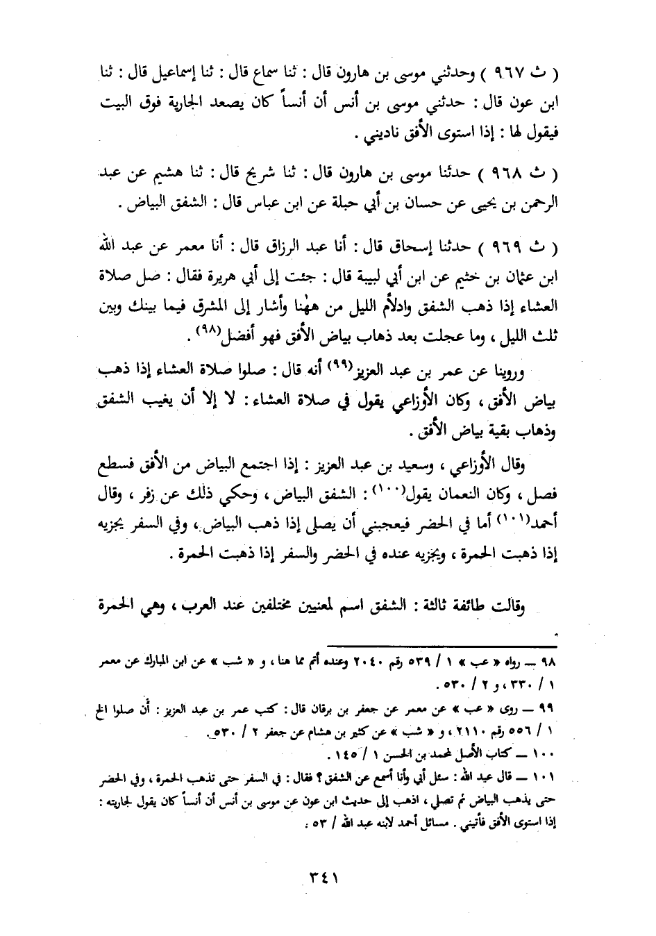 968 - حَدَّثَنَا مُوسَى بْنُ هَارُونَ، قَالَ: ثنا سُرَيْجٌ، قَالَ: ثنا هُشَيْمٌ، عَنْ عَبْدِ الرَّحْمَنِ بْنِ يَحْيَى، عَنْ حَسَّانَ بْنِ أَبِي حَبَلَةَ، عَنِ ابْنِ عَبَّاسٍ، قَالَ: الشَّفَقُ: الْبَيَاضُ
